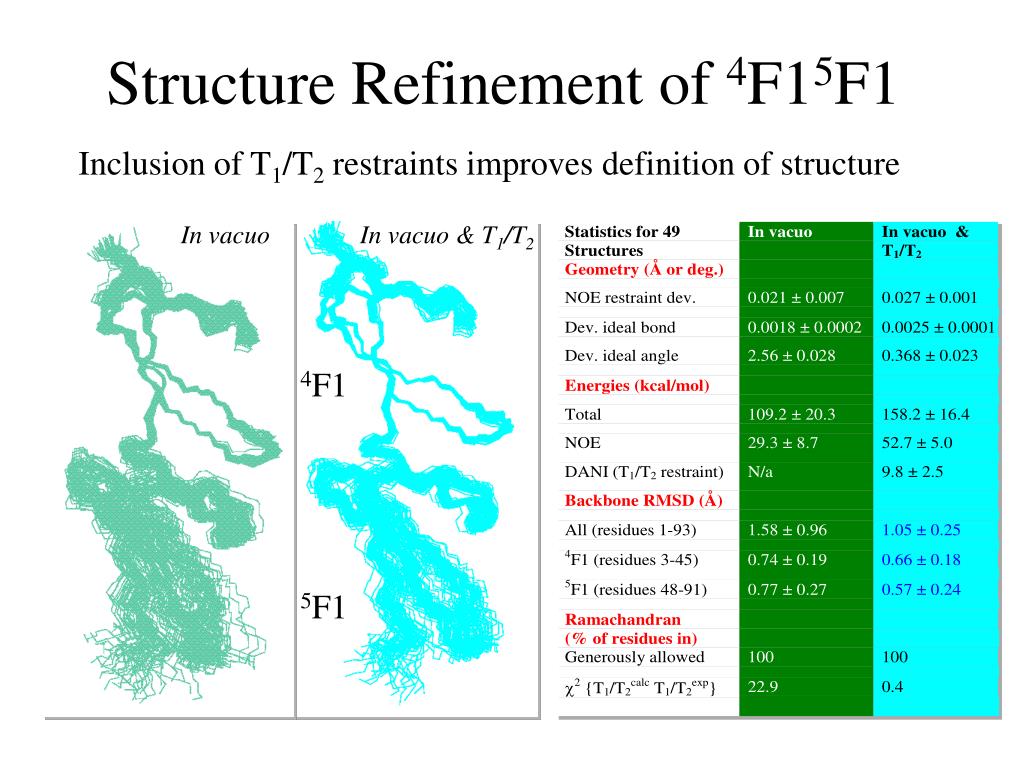 In vacuo In vacuo & T1/T2 4F1 5F1 Structure Refinement of 4F15F1 Inclusion of T1/T2 restraints improves definition of structure