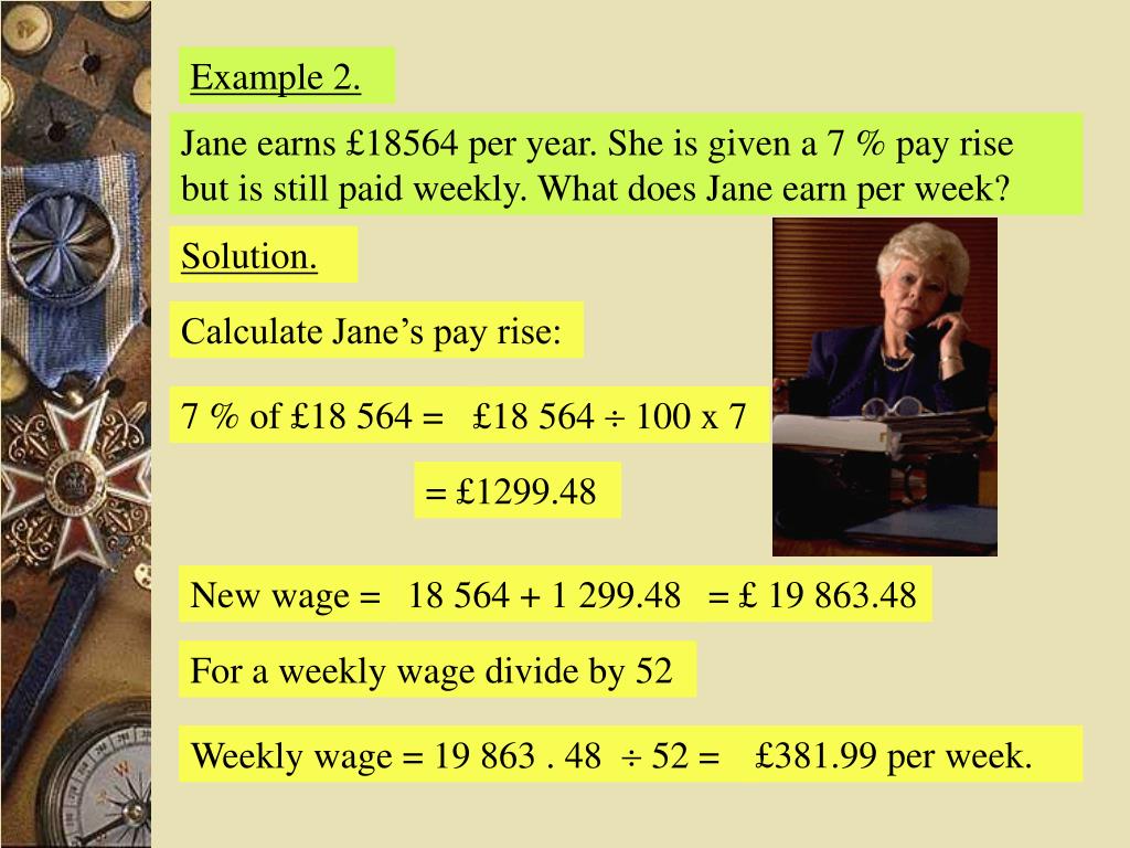 Jane earns £18564 per year. She is given a 7 % pay rise but is still paid weekly. What does Jane earn per week? Example 2. Solution. Calculate Jane’s pay rise: 7 % of £18 564 = £18 564 100 x 7 = £1299.48 New wage = 18 564 + 1 299.48 = £ 19 863.48 For a weekly wage divide by 52 Weekly wage = 19 863 . 48 52 = £381.99 per week.