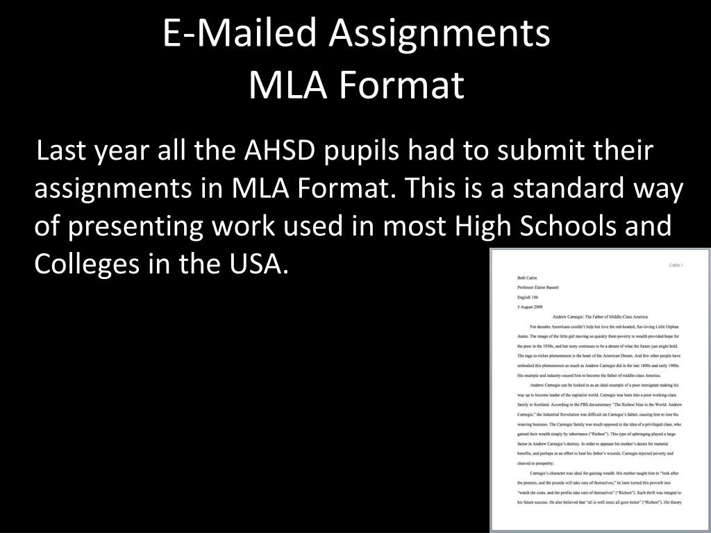 E-Mailed AssignmentsMLA Format Last year all the AHSD pupils had to submit their assignments in MLA Format. This is a standard way of presenting work used in most High Schools and Colleges in the USA.