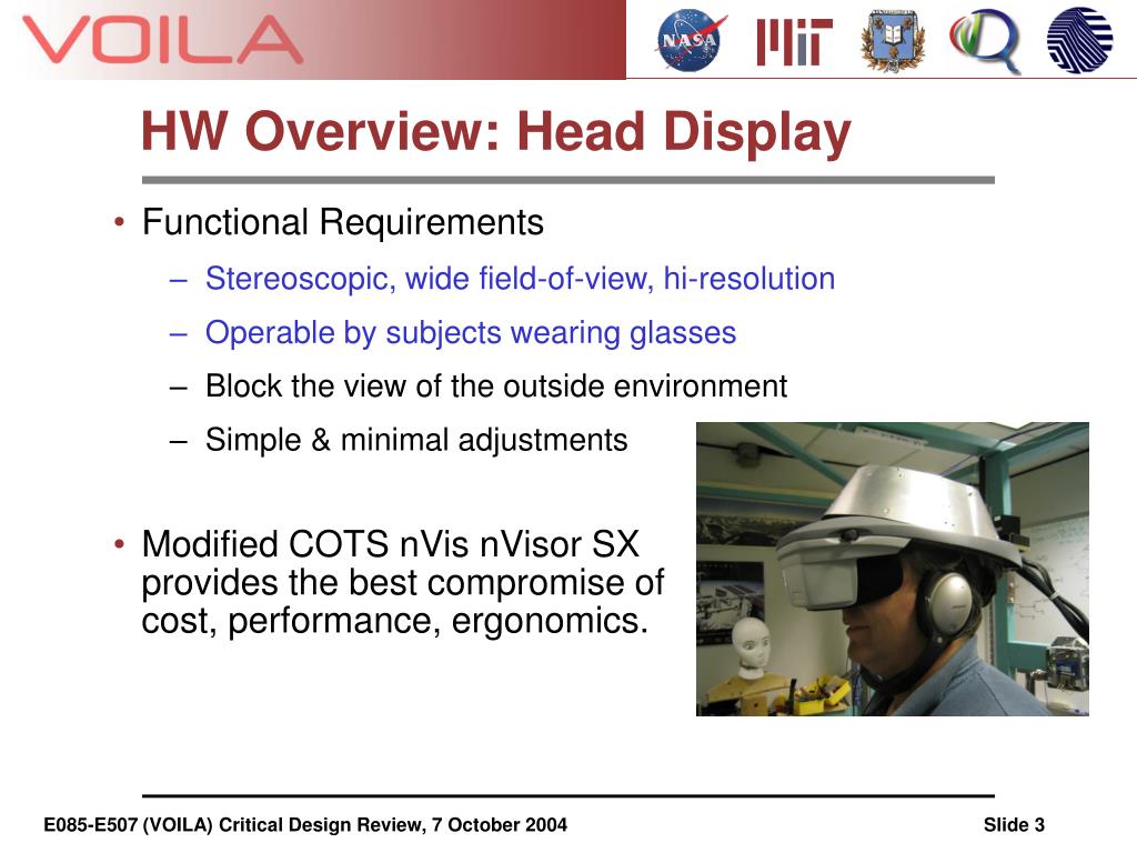 HW Overview: Head Display • Functional Requirements • Stereoscopic, wide field-of-view, hi-resolution • Operable by subjects wearing glasses • Block the view of the outside environment • Simple & minimal adjustments • Modified COTS nVis nVisor SX provides the best compromise ofcost, performance, ergonomics.