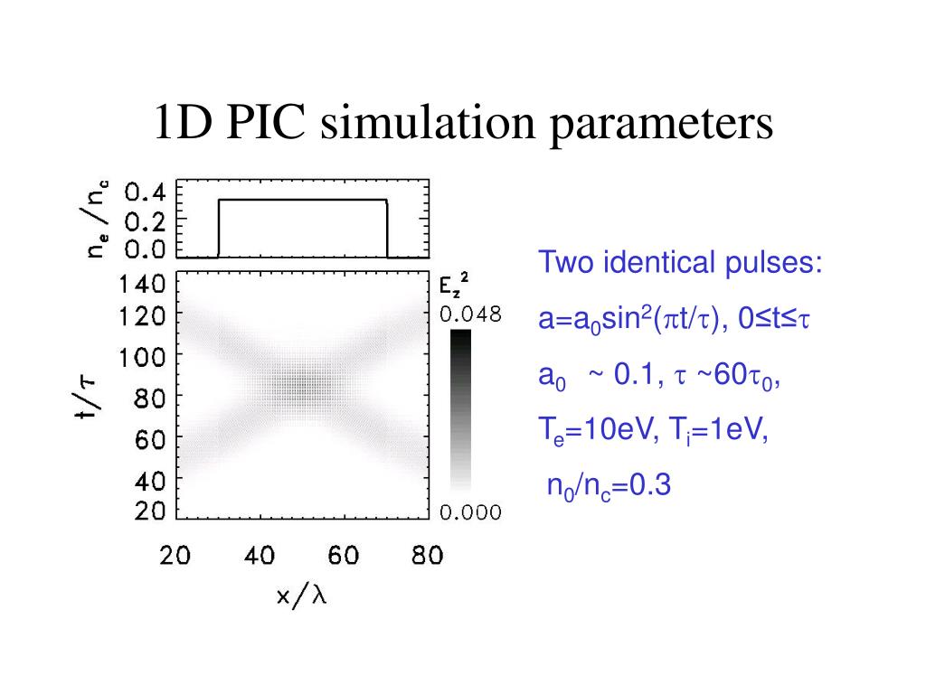 1D PIC simulation parameters Two identical pulses: a=a0sin2(pt/t), 0≤t≤t a0~ 0.1, t ~60t0, Te=10eV, Ti=1eV, n0/nc=0.3