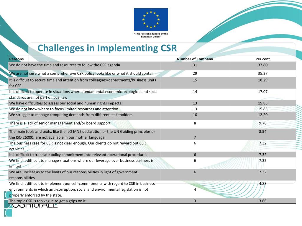 More than half of the surveyed companies are not aware of internationally recognised CSR initiatives. ADD MAIN CSR INITIATIVES IN TRAININGS. • Even if companies engage in CSR activities, they are not reporting such activities. REPORTING NEEDS SPECIAL ATTENTION. • Companies present willingness to participate in CSR trainings. PROVIDE FURTHER TRAININGS and FOCUS ON; • general information about CSR • human rights • the meaning of CSR and its advantages • information about responsibility towards employees and environment • introducing international standards • CSR project management. Conclusions and Recommendations II