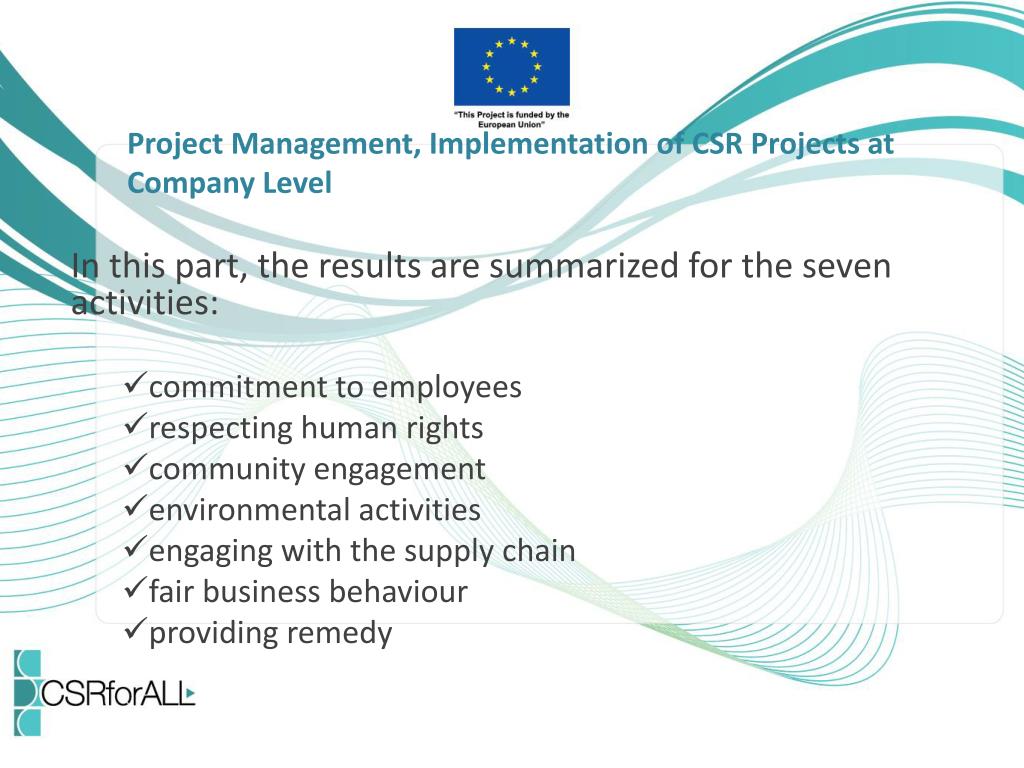 In this part, the results are summarized for the seven activities: commitment to employees respecting human rights community engagement environmental activities engaging with the supply chain fair business behaviour providing remedy Project Management, Implementation of CSR Projects at Company Level