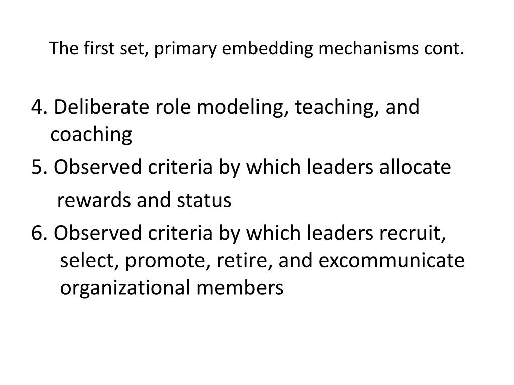 The first set, primary embedding mechanisms cont. 4. Deliberate role modeling, teaching, and coaching 5. Observed criteria by which leaders allocate rewards and status 6. Observed criteria by which leaders recruit, select, promote, retire, and excommunicate organizational members