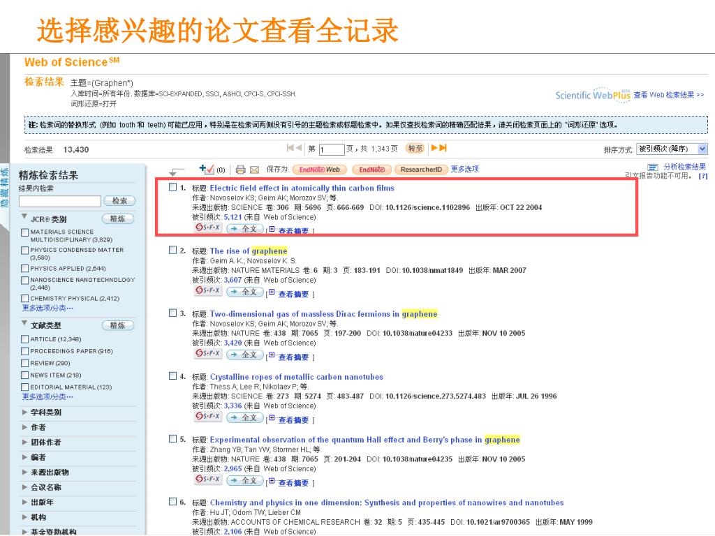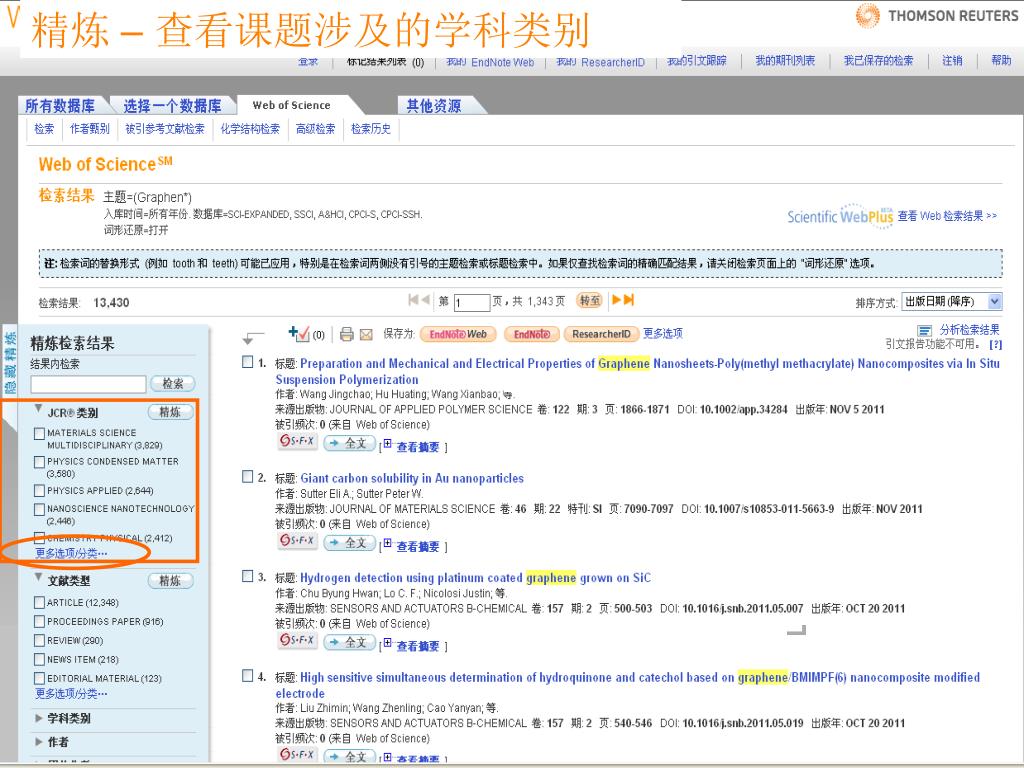 检索举例 1 :有关石墨烯的相关研究 检索词: Graphen*