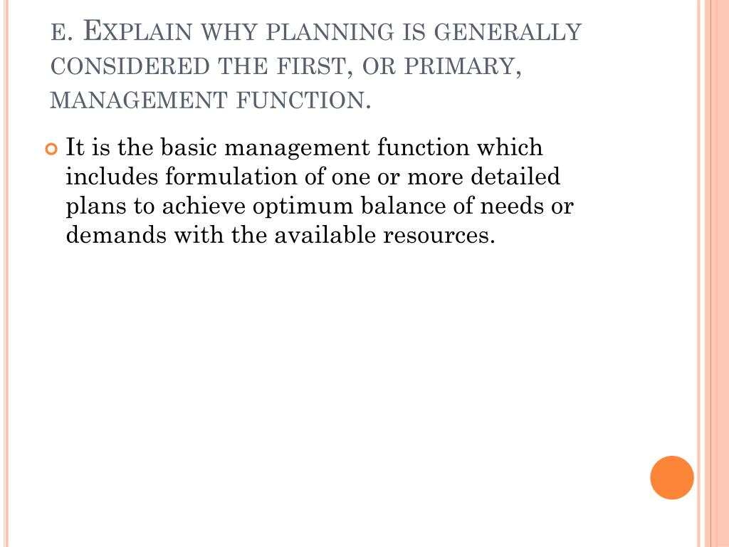 e. Explain why planning is generally considered the first, or primary, management function. • It is the basic management function which includes formulation of one or more detailed plans to achieve optimum balance of needs or demands with the available resources.