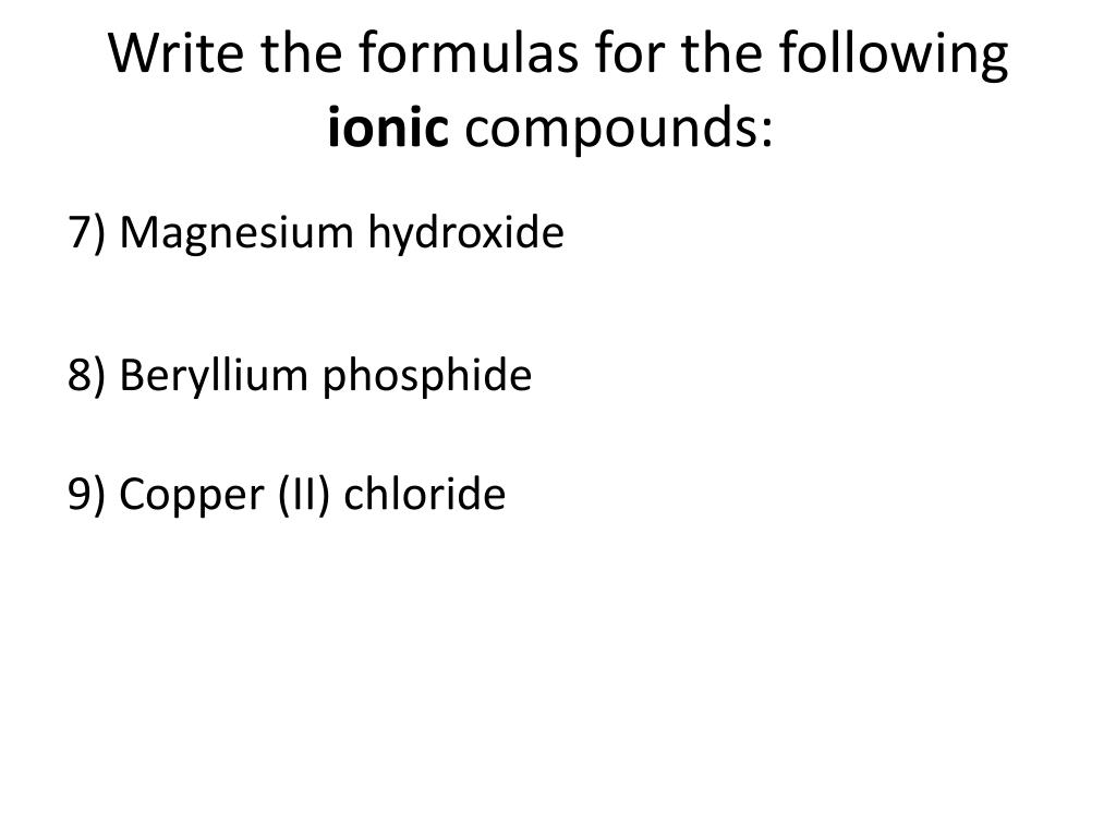 Write the formulas for the following ionic compounds: 7) Magnesium hydroxide 8) Beryllium phosphide 9) Copper (II) chloride