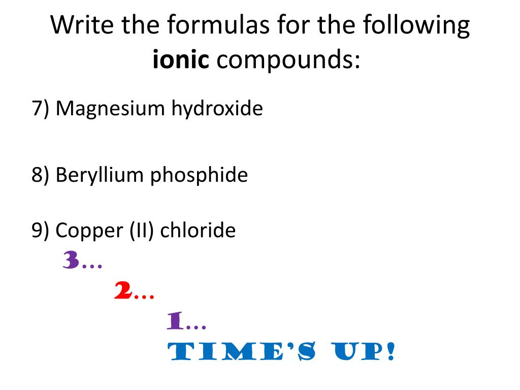 Write the formulas for the following ionic compounds: 7) Magnesium hydroxide 8) Beryllium phosphide 9) Copper (II) chloride 3… 2… 1… Time’s Up!