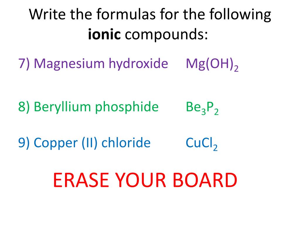 Write the formulas for the following ionic compounds: 7) Magnesium hydroxide 8) Beryllium phosphide 9) Copper (II) chloride Mg(OH)2 Be3P2 CuCl2 ERASE YOUR BOARD