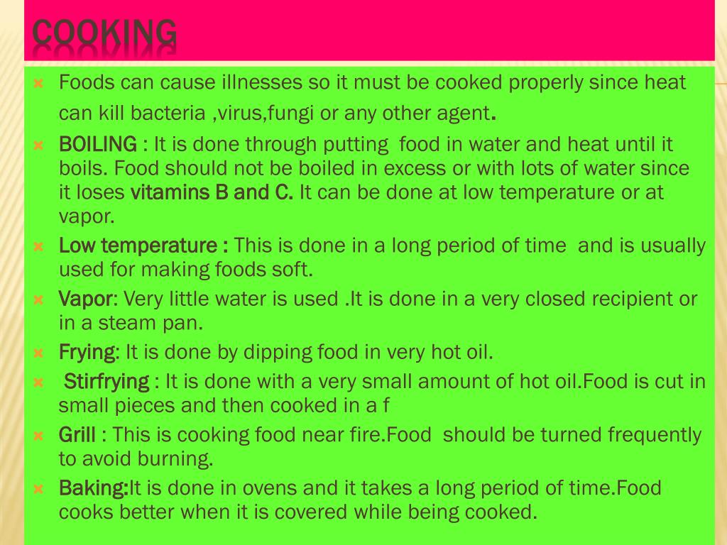 Foods can cause illnesses so it must be cooked properly since heat can kill bacteria ,virus,fungi or any other agent. BOILING : It is done through putting food in water and heat until it boils. Food should not be boiled in excess or with lots of water since it loses vitamins B and C. It can be done at low temperature or at vapor. Low temperature : This is done in a long period of time and is usually used for making foods soft. Vapor: Very little water is used .It is done in a very closed recipient or in a steam pan. Frying: It is done by dipping food in very hot oil. Stirfrying: It is done with a very small amount of hot oil.Food is cut in small pieces and then cooked in a f Grill : This is cooking food near fire.Food should be turned frequently to avoid burning. Baking:It is done in ovens and it takes a long period of time.Food cooks better when it is covered while being cooked. Cooking