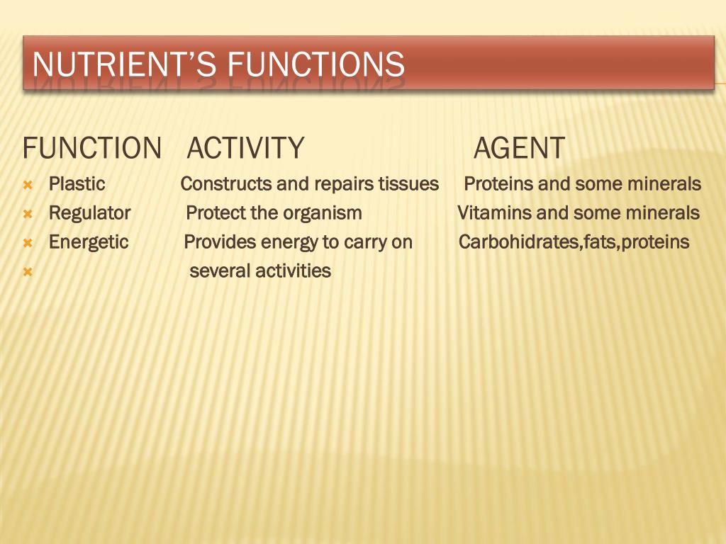 FUNCTION ACTIVITY AGENT Plastic Constructs and repairs tissues Proteins and some minerals Regulator Protect the organism Vitamins and some minerals Energetic Provides energy to carry on Carbohidrates,fats,proteins several activities Nutrient’s functions