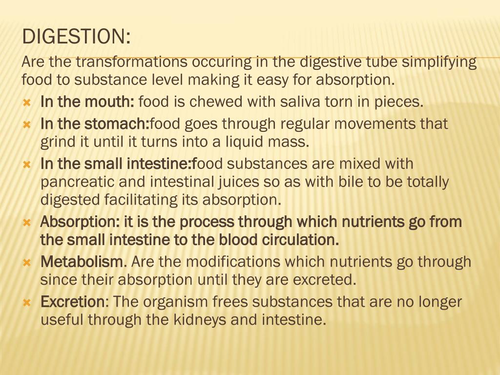 DIGESTION: Are the transformations occuring in the digestive tube simplifying food to substance level making it easy for absorption. In the mouth: food is chewed with saliva torn in pieces. In the stomach:food goes through regular movements that grind it until it turns into a liquid mass. In the small intestine:food substances are mixed with pancreatic and intestinal juices so as with bile to be totally digested facilitating its absorption. Absorption: it is the process through which nutrients go from the small intestine to the blood circulation. Metabolism. Are the modifications which nutrients go through since their absorption until they are excreted. Excretion: The organism frees substances that are no longer useful through the kidneys and intestine.