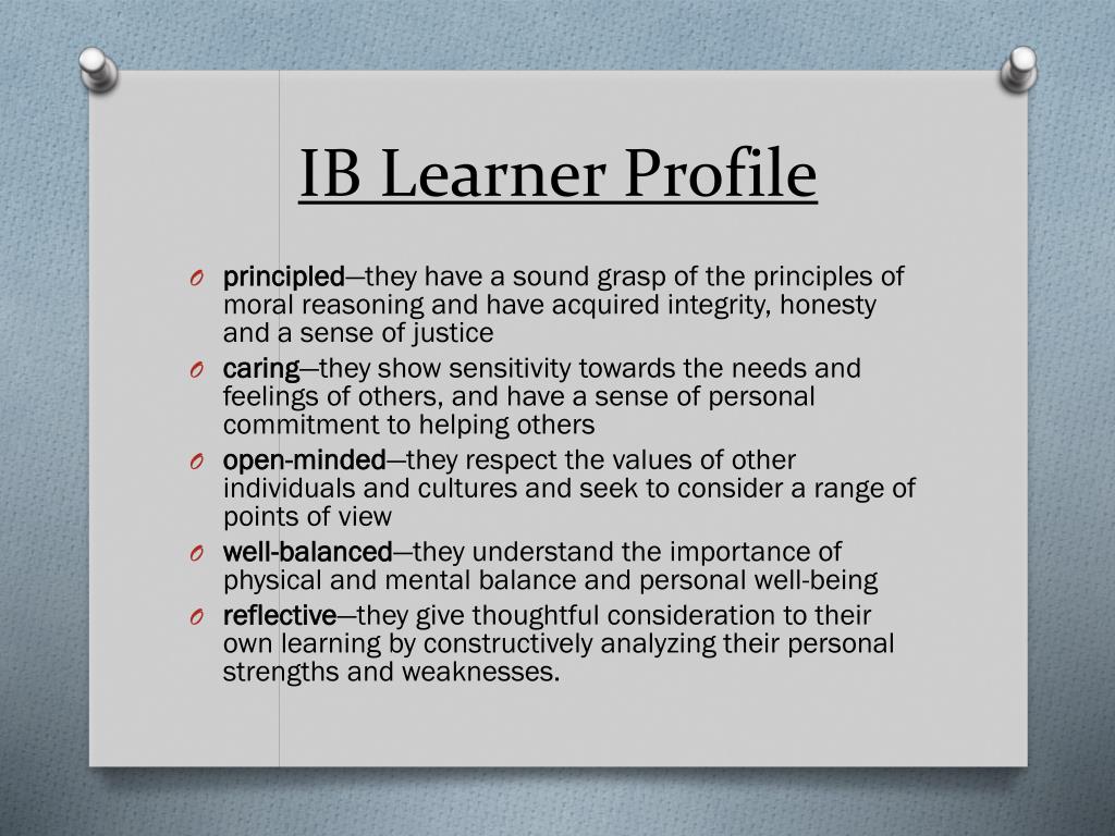 IB Learner Profile • principled—they have a sound grasp of the principles of moral reasoning and have acquired integrity, honesty and a sense of justice • caring—they show sensitivity towards the needs and feelings of others, and have a sense of personal commitment to helping others • open-minded—they respect the values of other individuals and cultures and seek to consider a range of points of view • well-balanced—they understand the importance of physical and mental balance and personal well-being • reflective—they give thoughtful consideration to their own learning by constructively analyzing their personal strengths and weaknesses.