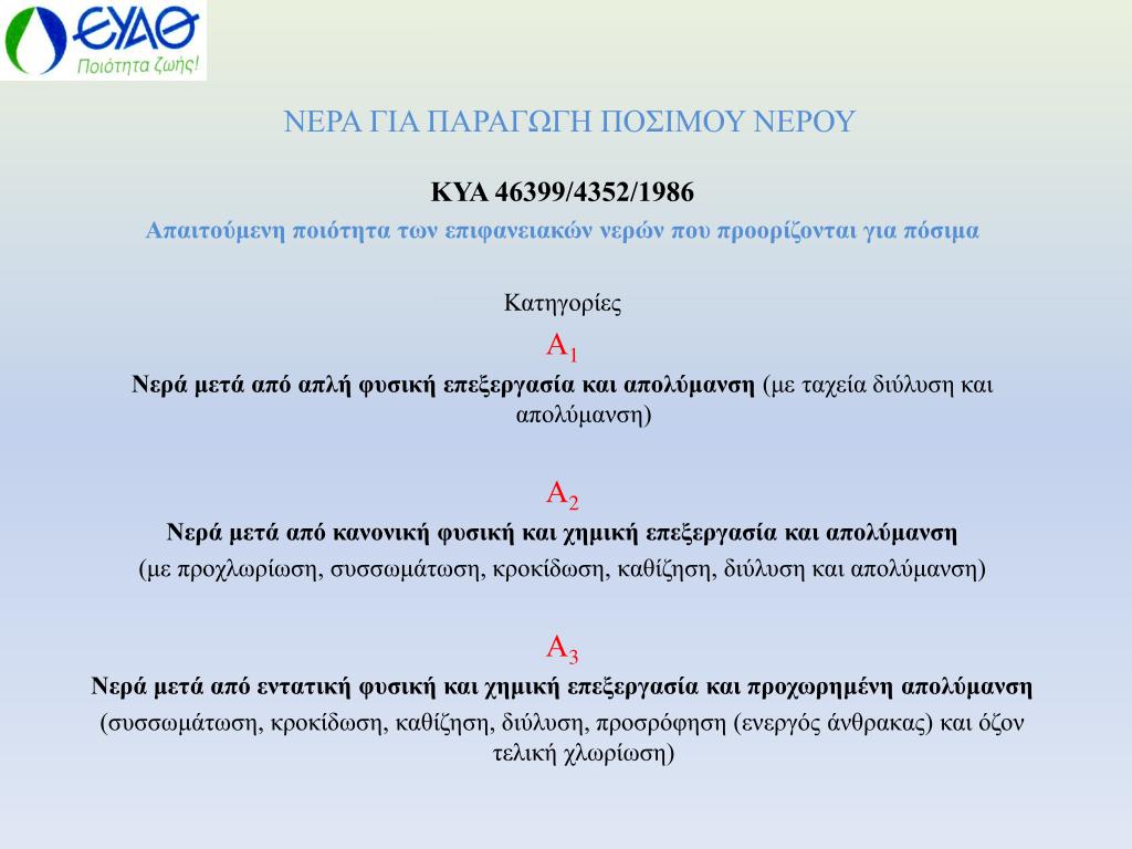 ΝΕΡΑ ΓΙΑ ΠΑΡΑΓΩΓΗ ΠΟΣΙΜΟΥ ΝΕΡΟΥ ΚΥΑ 46399/4352/1986 Απαιτούμενη ποιότητα των επιφανειακών νερών που προορίζονται για πόσιμα Κατηγορίες Α1 Νερά μετά από απλή φυσική επεξεργασία και απολύμανση (με ταχεία διύλυση και απολύμανση) Α2 Νερά μετά από κανονική φυσική και χημική επεξεργασία και απολύμανση (με προχλωρίωση, συσσωμάτωση, κροκίδωση, καθίζηση, διύλυση και απολύμανση) Α3 Νερά μετά από εντατική φυσική και χημική επεξεργασία και προχωρημένη απολύμανση (συσσωμάτωση, κροκίδωση, καθίζηση, διύλυση, προσρόφηση (ενεργός άνθρακας) και όζον τελική χλωρίωση)