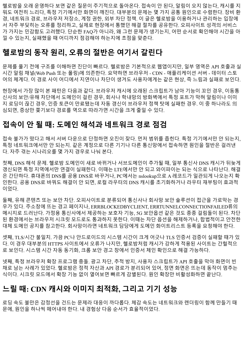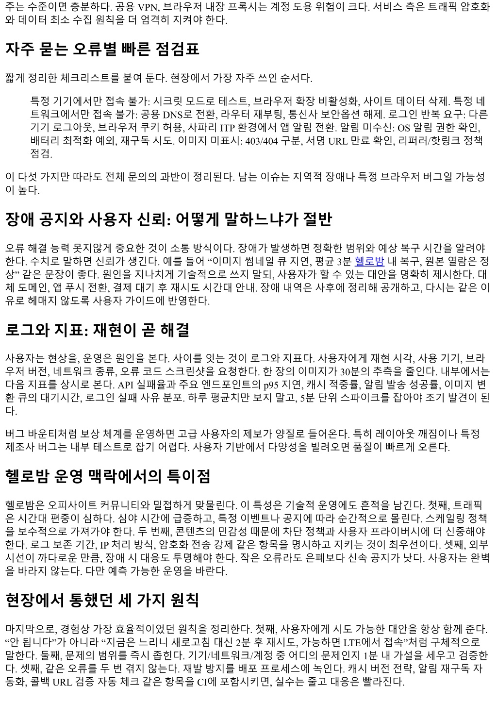 주는수준이면충분하다. 공용 VPN, 브라우저내장프록시는계정도용위험이크다. 서비스측은트래픽암호화 와데이터최소수집원칙을더엄격히지켜야한다. 자주묻는오류별빠른점검표 짧게정리한체크리스트를붙여둔다. 현장에서가장자주쓰인순서다. 특정기기에서만접속불가: 시크릿모드로테스트, 브라우저확장비활성화, 사이트데이터삭제. 특정네 트워크에서만접속불가: 공용 DNS로전환, 라우터재부팅, 통신사보안옵션해제. 로그인반복요구: 다른 기기로그아웃, 브라우저쿠키허용, 사파리 ITP 환경에서앱알림전환. 알림미수신: OS 알림권한확인, 배터리최적화예외, 재구독시도. 이미지미표시: 403/404 구분, 서명 URL 만료확인, 리퍼러/핫링크정책 점검. 이다섯가지만따라도전체문의의과반이정리된다. 남는이슈는지역적장애나특정브라우저버그일가능성 이높다. 장애공지와사용자신뢰: 어떻게말하느냐가절반 오류해결능력못지않게중요한것이소통방식이다. 장애가발생하면정확한범위와예상복구시간을알려야 한다. 수치로말하면신뢰가생긴다. 예를들어 “이미지썸네일큐지연, 평균 3분헬로밤내복구, 원본열람은정 상” 같은문장이좋다. 원인을지나치게기술적으로쓰지말되, 사용자가할수있는대안을명확히제시한다. 대 체도메인, 앱푸시전환, 결제대기후재시도시간대안내. 장애내역은사후에정리해공개하고, 다시는같은이 유로헤매지않도록사용자가이드에반영한다. 로그와지표: 재현이곧해결 사용자는현상을, 운영은원인을본다. 사이를잇는것이로그와지표다. 사용자에게재현시각, 사용기기, 브라 우저버전, 네트워크종류, 오류코드스크린샷을요청한다. 한장의이미지가 30분의추측을줄인다. 내부에서는 다음지표를상시로본다. API 실패율과주요엔드포인트의 p95 지연, 캐시적중률, 알림발송성공률, 이미지변 환큐의대기시간, 로그인실패사유분포. 하루평균치만보지말고, 5분단위스파이크를잡아야조기발견이된 다. 버그바운티처럼보상체계를운영하면고급사용자의제보가양질로들어온다. 특히레이아웃깨짐이나특정 제조사버그는내부테스트로잡기어렵다. 사용자기반에서다양성을빌려오면품질이빠르게오른다. 헬로밤운영맥락에서의특이점 헬로밤은오피사이트커뮤니티와밀접하게맞물린다. 이특성은기술적운영에도흔적을남긴다. 첫째, 트래픽 은시간대편중이심하다. 심야시간에급증하고, 특정이벤트나공지에따라순간적으로몰린다. 스케일링정책 을보수적으로가져가야한다. 두번째, 콘텐츠의민감성때문에차단정책과사용자프라이버시에더신중해야 한다. 로그보존기간, IP 처리방식, 암호화전송강제같은항목을명시하고지키는것이최우선이다. 셋째, 외부 시선이까다로운만큼, 장애시대응도투명해야한다. 작은오류라도은폐보다신속공지가낫다. 사용자는완벽 을바라지않는다. 다만예측가능한운영을바란다. 현장에서통했던세가지원칙 마지막으로, 경험상가장효율적이었던원칙을정리한다. 첫째, 사용자에게시도가능한대안을항상함께준다. “안됩니다”가아니라 “지금은느리니새로고침대신 2분후재시도, 가능하면 LTE에서접속”처럼구체적으로 말한다. 둘째, 문제의범위를즉시좁힌다. 기기/네트워크/계정중어디의문제인지 1분내가설을세우고검증한 다. 셋째, 같은오류를두번겪지않는다. 재발방지를배포프로세스에녹인다. 캐시버전전략, 알림재구독자 동화, 콜백 URL 검증자동체크같은항목을 CI에포함시키면, 실수는줄고대응은빨라진다.