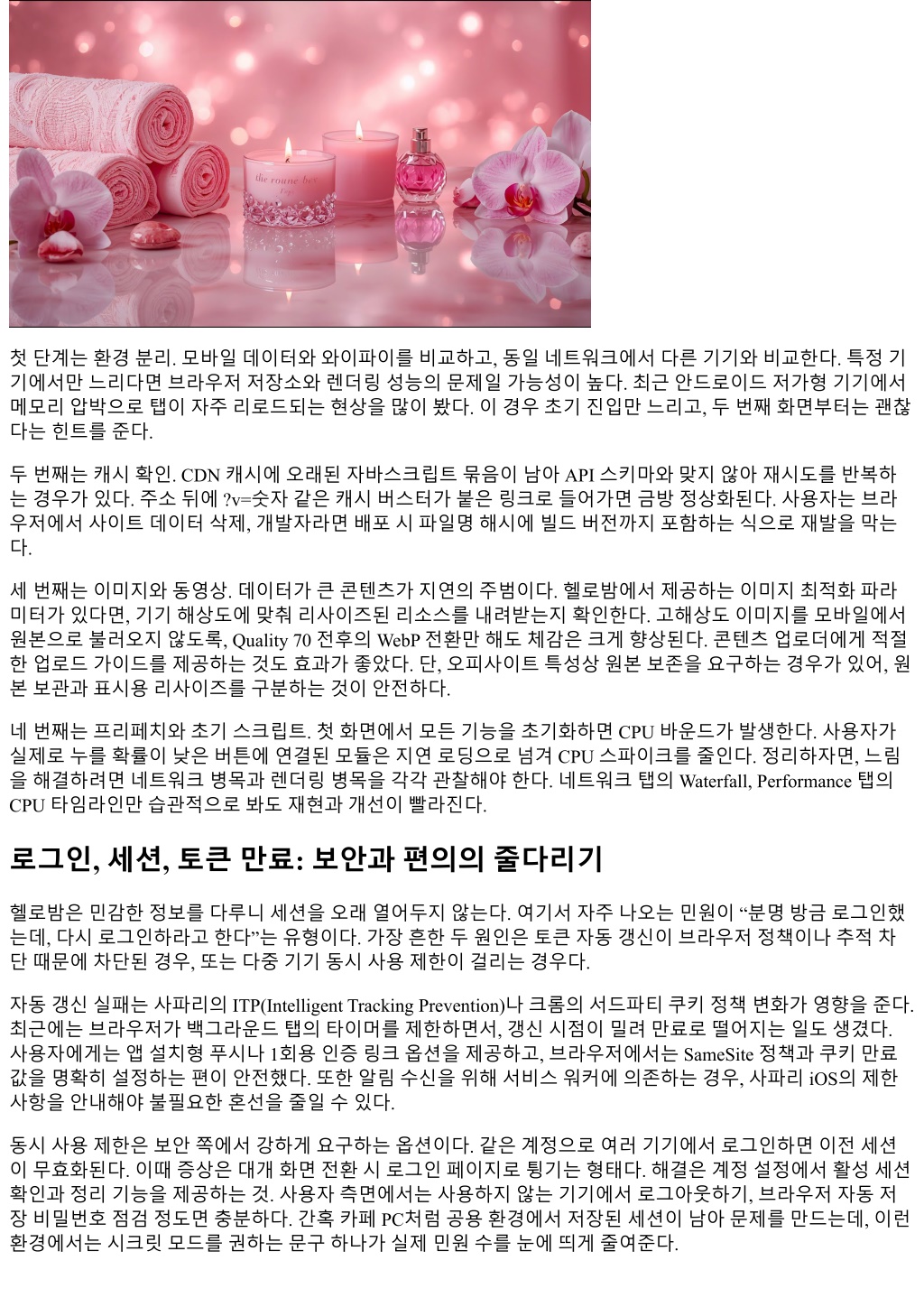 첫단계는환경분리. 모바일데이터와와이파이를비교하고, 동일네트워크에서다른기기와비교한다. 특정기 기에서만느리다면브라우저저장소와렌더링성능의문제일가능성이높다. 최근안드로이드저가형기기에서 메모리압박으로탭이자주리로드되는현상을많이봤다. 이경우초기진입만느리고, 두번째화면부터는괜찮 다는힌트를준다. 두번째는캐시확인. CDN 캐시에오래된자바스크립트묶음이남아 API 스키마와맞지않아재시도를반복하 는경우가있다. 주소뒤에 ?v=숫자같은캐시버스터가붙은링크로들어가면금방정상화된다. 사용자는브라 우저에서사이트데이터삭제, 개발자라면배포시파일명해시에빌드버전까지포함하는식으로재발을막는 다. 세번째는이미지와동영상. 데이터가큰콘텐츠가지연의주범이다. 헬로밤에서제공하는이미지최적화파라 미터가있다면, 기기해상도에맞춰리사이즈된리소스를내려받는지확인한다. 고해상도이미지를모바일에서 원본으로불러오지않도록, Quality 70 전후의 WebP 전환만해도체감은크게향상된다. 콘텐츠업로더에게적절 한업로드가이드를제공하는것도효과가좋았다. 단, 오피사이트특성상원본보존을요구하는경우가있어, 원 본보관과표시용리사이즈를구분하는것이안전하다. 네번째는프리페치와초기스크립트. 첫화면에서모든기능을초기화하면 CPU 바운드가발생한다. 사용자가 실제로누를확률이낮은버튼에연결된모듈은지연로딩으로넘겨 CPU 스파이크를줄인다. 정리하자면, 느림 을해결하려면네트워크병목과렌더링병목을각각관찰해야한다. 네트워크탭의 Waterfall, Performance 탭의 CPU 타임라인만습관적으로봐도재현과개선이빨라진다. 로그인, 세션, 토큰만료: 보안과편의의줄다리기 헬로밤은민감한정보를다루니세션을오래열어두지않는다. 여기서자주나오는민원이 “분명방금로그인했 는데, 다시로그인하라고한다”는유형이다. 가장흔한두원인은토큰자동갱신이브라우저정책이나추적차 단때문에차단된경우, 또는다중기기동시사용제한이걸리는경우다. 자동갱신실패는사파리의 ITP(Intelligent Tracking Prevention)나크롬의서드파티쿠키정책변화가영향을준다. 최근에는브라우저가백그라운드탭의타이머를제한하면서, 갱신시점이밀려만료로떨어지는일도생겼다. 사용자에게는앱설치형푸시나 1회용인증링크옵션을제공하고, 브라우저에서는 SameSite 정책과쿠키만료 값을명확히설정하는편이안전했다. 또한알림수신을위해서비스워커에의존하는경우, 사파리 iOS의제한 사항을안내해야불필요한혼선을줄일수있다. 동시사용제한은보안쪽에서강하게요구하는옵션이다. 같은계정으로여러기기에서로그인하면이전세션 이무효화된다. 이때증상은대개화면전환시로그인페이지로튕기는형태다. 해결은계정설정에서활성세션 확인과정리기능을제공하는것. 사용자측면에서는사용하지않는기기에서로그아웃하기, 브라우저자동저 장비밀번호점검정도면충분하다. 간혹카페 PC처럼공용환경에서저장된세션이남아문제를만드는데, 이런 환경에서는시크릿모드를권하는문구하나가실제민원수를눈에띄게줄여준다.