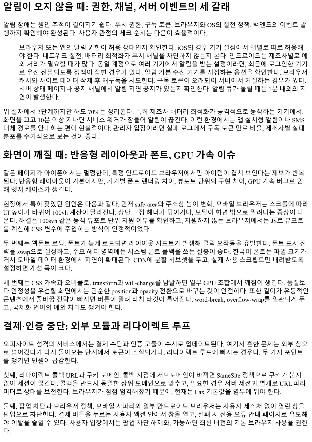 알림이오지않을때: 권한, 채널, 서버이벤트의세갈래 알림장애는원인추적이길어지기쉽다. 푸시권한, 구독토큰, 브라우저와 OS의절전정책, 백엔드의이벤트발 행까지확인해야완성된다. 사용자관점의체크순서는다음이효율적이다. 브라우저또는앱의알림권한이허용상태인지확인한다. iOS의경우기기설정에서앱별로따로허용해 야한다. 네트워크절전, 배터리최적화가푸시채널을차단하지않는지본다. 안드로이드는제조사별로예 외처리가필요할때가많다. 동일계정으로여러기기에서알림을받는설정이라면, 최근에로그인한기기 로우선전달되도록정책이잡힌경우가있다. 알림기본수신기기를지정하는옵션을확인한다. 브라우저 캐시와사이트데이터삭제후재구독을시도한다. 구독토큰이오래되어서버에서거절하는경우가있다. 서버상태페이지나공지채널에서알림지연공지가있는지확인한다. 알림큐가몰릴때는 1분내외의지 연이발생한다. 위절차에서 3단계까지만해도 70%는정리된다. 특히제조사배터리최적화가공격적으로동작하는기기에서, 화면을끄고 10분이상지나면서비스워커가잠들어알림이끊긴다. 이런환경에서는앱설치형알림이나 SMS 대체경로를안내하는편이현실적이다. 관리자입장이라면실패로그에서구독토큰만료비율, 제조사별실패 분포를주기적으로보는것이좋다. 화면이깨질때: 반응형레이아웃과폰트, GPU 가속이슈 같은페이지가아이폰에서는멀쩡한데, 특정안드로이드브라우저에서만아이템이겹쳐보인다는제보가반복 된다. 반응형레이아웃이기본이지만, 기기별폰트렌더링차이, 뷰포트단위의구현차이, GPU 가속버그로인 해엣지케이스가생긴다. 현장에서특히잦았던원인은다음과같다. 먼저 safe-area와주소창높이변화. 모바일브라우저는스크롤에따라 UI 높이가바뀌어 100vh 계산이달라진다. 상단고정헤더가덮이거나, 모달이화면밖으로밀려나는증상이나 온다. 해결은 100svh 같은동적뷰포트단위지원여부를확인하고, 지원하지않는브라우저에서는 JS로뷰포트 를계산해 CSS 변수에주입하는방식이안정적이었다. 두번째는웹폰트로딩. 폰트가늦게로드되면레이아웃시프트가발생해클릭오작동을유발한다. 폰트표시전 략을 swap으로설정하고, 주요헤더영역에는시스템폰트폴백을쓰는절충이좋다. 한국어폰트는파일크기가 커서모바일데이터환경에서지연이확대된다. CDN에분할서브셋을두고, 실제사용스크립트만내려받도록 설정하면개선폭이크다. 세번째는 CSS 가속과오버플로. transform과 will-change를남발하면일부 GPU 조합에서깨짐이생긴다. 품질보 다안정성을우선할화면에서는단순한 position과 opacity 전환으로바꾸는것이안전하다. 또한길이가유동적인 콘텐츠에서줄바꿈전략이빠지면버튼이밀려터치타깃이틀어진다. word-break, overflow-wrap를일관되게두 고, 국제화언어의예외처리도챙겨야한다. 결제·인증중단: 외부모듈과리다이렉트루프 오피사이트성격의서비스에서는결제수단과인증모듈이수시로업데이트된다. 여기서흔한문제는외부창으 로넘어갔다가다시돌아오는단계에서토큰이소실되거나, 리다이렉트루프에빠지는경우다. 두가지포인트 를챙기면민원이급감한다. 첫째, 리다이렉트콜백 URL과쿠키도메인. 콜백시점에서브도메인이바뀌면 SameSite 정책으로쿠키가붙지 않아세션이끊긴다. 콜백을반드시동일한상위도메인으로맞추고, 필요한경우서버세션과별개로 URL 파라 미터로상태를보전한다. 브라우저가점점엄격해졌기때문에, 현재는 Lax 기본값을염두에둬야한다. 둘째, 팝업차단과브라우저정책. 모바일사파리와일부안드로이드브라우저는사용자제스처없이열린창을 팝업으로차단한다. 결제버튼을누르는사용자액션안에서창을열고, 실패시전용오류안내페이지로유도해 야이탈을줄일수있다. 사용자입장에서는팝업차단해제와, 가능하면최신버전의기본브라우저사용을권한 다.