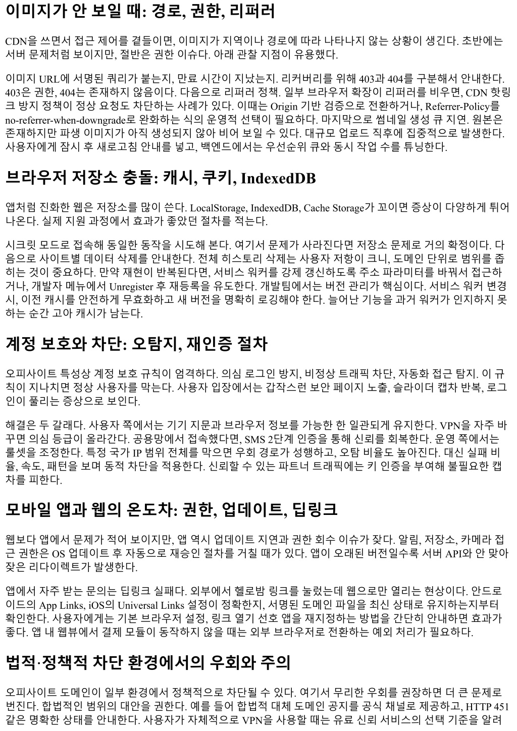 이미지가안보일때: 경로, 권한, 리퍼러 CDN을쓰면서접근제어를곁들이면, 이미지가지역이나경로에따라나타나지않는상황이생긴다. 초반에는 서버문제처럼보이지만, 절반은권한이슈다. 아래관찰지점이유용했다. 이미지 URL에서명된쿼리가붙는지, 만료시간이지났는지. 리커버리를위해 403과 404를구분해서안내한다. 403은권한, 404는존재하지않음이다. 다음으로리퍼러정책. 일부브라우저확장이리퍼러를비우면, CDN 핫링 크방지정책이정상요청도차단하는사례가있다. 이때는 Origin 기반검증으로전환하거나, Referrer-Policy를 no-referrer-when-downgrade로완화하는식의운영적선택이필요하다. 마지막으로썸네일생성큐지연. 원본은 존재하지만파생이미지가아직생성되지않아비어보일수있다. 대규모업로드직후에집중적으로발생한다. 사용자에게잠시후새로고침안내를넣고, 백엔드에서는우선순위큐와동시작업수를튜닝한다. 브라우저저장소충돌: 캐시, 쿠키, IndexedDB 앱처럼진화한웹은저장소를많이쓴다. LocalStorage, IndexedDB, Cache Storage가꼬이면증상이다양하게튀어 나온다. 실제지원과정에서효과가좋았던절차를적는다. 시크릿모드로접속해동일한동작을시도해본다. 여기서문제가사라진다면저장소문제로거의확정이다. 다 음으로사이트별데이터삭제를안내한다. 전체히스토리삭제는사용자저항이크니, 도메인단위로범위를좁 히는것이중요하다. 만약재현이반복된다면, 서비스워커를강제갱신하도록주소파라미터를바꿔서접근하 거나, 개발자메뉴에서 Unregister 후재등록을유도한다. 개발팀에서는버전관리가핵심이다. 서비스워커변경 시, 이전캐시를안전하게무효화하고새버전을명확히로깅해야한다. 늘어난기능을과거워커가인지하지못 하는순간고아캐시가남는다. 계정보호와차단: 오탐지, 재인증절차 오피사이트특성상계정보호규칙이엄격하다. 의심로그인방지, 비정상트래픽차단, 자동화접근탐지. 이규 칙이지나치면정상사용자를막는다. 사용자입장에서는갑작스런보안페이지노출, 슬라이더캡차반복, 로그 인이풀리는증상으로보인다. 해결은두갈래다. 사용자쪽에서는기기지문과브라우저정보를가능한한일관되게유지한다. VPN을자주바 꾸면의심등급이올라간다. 공용망에서접속했다면, SMS 2단계인증을통해신뢰를회복한다. 운영쪽에서는 룰셋을조정한다. 특정국가 IP 범위전체를막으면우회경로가성행하고, 오탐비율도높아진다. 대신실패비 율, 속도, 패턴을보며동적차단을적용한다. 신뢰할수있는파트너트래픽에는키인증을부여해불필요한캡 차를피한다. 모바일앱과웹의온도차: 권한, 업데이트, 딥링크 웹보다앱에서문제가적어보이지만, 앱역시업데이트지연과권한회수이슈가잦다. 알림, 저장소, 카메라접 근권한은 OS 업데이트후자동으로재승인절차를거칠때가있다. 앱이오래된버전일수록서버 API와안맞아 잦은리다이렉트가발생한다. 앱에서자주받는문의는딥링크실패다. 외부에서헬로밤링크를눌렀는데웹으로만열리는현상이다. 안드로 이드의 App Links, iOS의 Universal Links 설정이정확한지, 서명된도메인파일을최신상태로유지하는지부터 확인한다. 사용자에게는기본브라우저설정, 링크열기선호앱을재지정하는방법을간단히안내하면효과가 좋다. 앱내웹뷰에서결제모듈이동작하지않을때는외부브라우저로전환하는예외처리가필요하다. 법적·정책적차단환경에서의우회와주의 오피사이트도메인이일부환경에서정책적으로차단될수있다. 여기서무리한우회를권장하면더큰문제로 번진다. 합법적인범위의대안을권한다. 예를들어합법적대체도메인공지를공식채널로제공하고, HTTP 451 같은명확한상태를안내한다. 사용자가자체적으로 VPN을사용할때는유료신뢰서비스의선택기준을알려