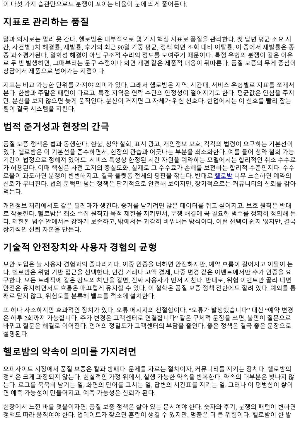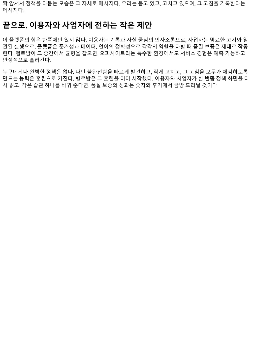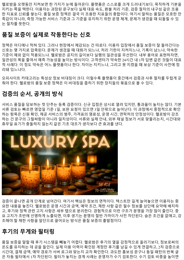 짝앞서서정책을다듬는모습은그자체로메시지다. 우리는듣고있고, 고치고있으며, 그고침을기록한다는 메시지다. 끝으로, 이용자와사업자에전하는작은제안 이플랫폼의힘은한쪽에만있지않다. 이용자는기록과사실중심의의사소통으로, 사업자는명료한고지와일 관된실행으로, 플랫폼은준거성과데이터, 언어의정확성으로각각의역할을다할때품질보증은제대로작동 한다. 헬로밤이그중간에서균형을잡으면, 오피사이트라는특수한환경에서도서비스경험은예측가능하고 안정적으로흘러간다. 누구에게나완벽한정책은없다. 다만불완전함을빠르게발견하고, 작게고치고, 그고침을모두가체감하도록 만드는능력은훈련으로커진다. 헬로밤은그훈련을이미시작했다. 이용자와사업자가한번쯤정책화면을다 시읽고, 작은습관하나를바꿔준다면, 품질보증의성과는숫자와후기에서금방드러날것이다.