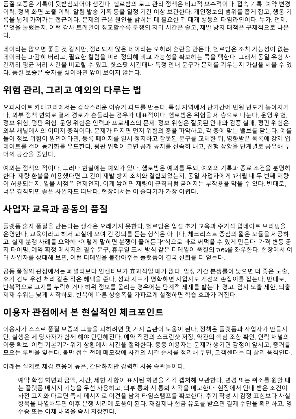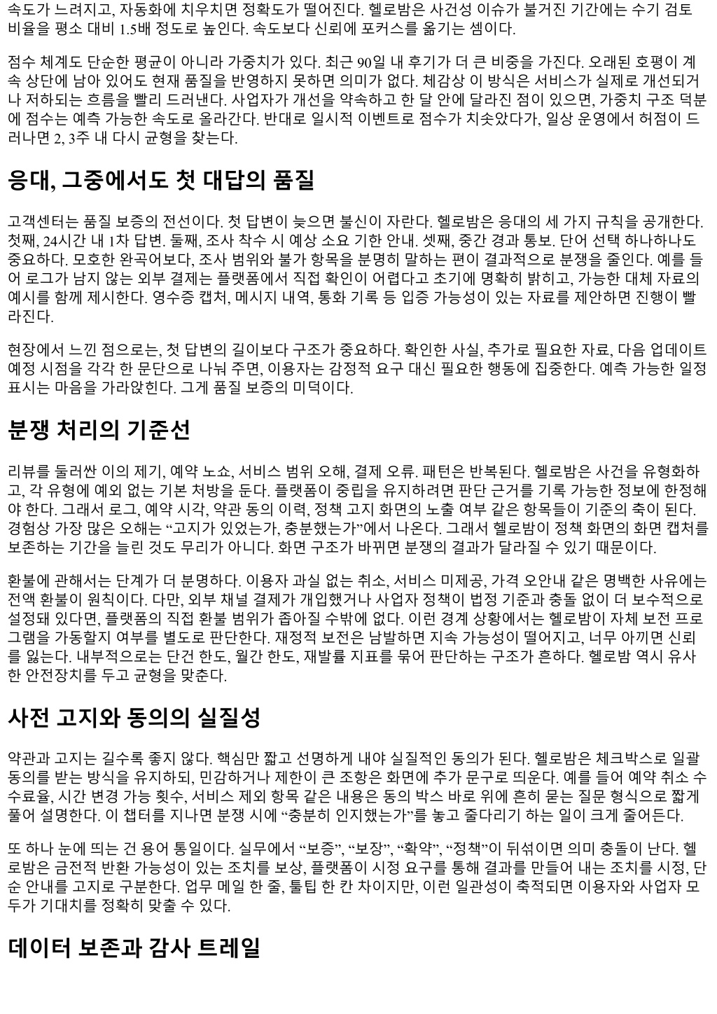 속도가느려지고, 자동화에치우치면정확도가떨어진다. 헬로밤은사건성이슈가불거진기간에는수기검토 비율을평소대비 1.5배정도로높인다. 속도보다신뢰에포커스를옮기는셈이다. 점수체계도단순한평균이아니라가중치가있다. 최근 90일내후기가더큰비중을가진다. 오래된호평이계 속상단에남아있어도현재품질을반영하지못하면의미가없다. 체감상이방식은서비스가실제로개선되거 나저하되는흐름을빨리드러낸다. 사업자가개선을약속하고한달안에달라진점이있으면, 가중치구조덕분 에점수는예측가능한속도로올라간다. 반대로일시적이벤트로점수가치솟았다가, 일상운영에서허점이드 러나면 2, 3주내다시균형을찾는다. 응대, 그중에서도첫대답의품질 고객센터는품질보증의전선이다. 첫답변이늦으면불신이자란다. 헬로밤은응대의세가지규칙을공개한다. 첫째, 24시간내 1차답변. 둘째, 조사착수시예상소요기한안내. 셋째, 중간경과통보. 단어선택하나하나도 중요하다. 모호한완곡어보다, 조사범위와불가항목을분명히말하는편이결과적으로분쟁을줄인다. 예를들 어로그가남지않는외부결제는플랫폼에서직접확인이어렵다고초기에명확히밝히고, 가능한대체자료의 예시를함께제시한다. 영수증캡처, 메시지내역, 통화기록등입증가능성이있는자료를제안하면진행이빨 라진다. 현장에서느낀점으로는, 첫답변의길이보다구조가중요하다. 확인한사실, 추가로필요한자료, 다음업데이트 예정시점을각각한문단으로나눠주면, 이용자는감정적요구대신필요한행동에집중한다. 예측가능한일정 표시는마음을가라앉힌다. 그게품질보증의미덕이다. 분쟁처리의기준선 리뷰를둘러싼이의제기, 예약노쇼, 서비스범위오해, 결제오류. 패턴은반복된다. 헬로밤은사건을유형화하 고, 각유형에예외없는기본처방을둔다. 플랫폼이중립을유지하려면판단근거를기록가능한정보에한정해 야한다. 그래서로그, 예약시각, 약관동의이력, 정책고지화면의노출여부같은항목들이기준의축이된다. 경험상가장많은오해는 “고지가있었는가, 충분했는가”에서나온다. 그래서헬로밤이정책화면의화면캡처를 보존하는기간을늘린것도무리가아니다. 화면구조가바뀌면분쟁의결과가달라질수있기때문이다. 환불에관해서는단계가더분명하다. 이용자과실없는취소, 서비스미제공, 가격오안내같은명백한사유에는 전액환불이원칙이다. 다만, 외부채널결제가개입했거나사업자정책이법정기준과충돌없이더보수적으로 설정돼있다면, 플랫폼의직접환불범위가좁아질수밖에없다. 이런경계상황에서는헬로밤이자체보전프로 그램을가동할지여부를별도로판단한다. 재정적보전은남발하면지속가능성이떨어지고, 너무아끼면신뢰 를잃는다. 내부적으로는단건한도, 월간한도, 재발률지표를묶어판단하는구조가흔하다. 헬로밤역시유사 한안전장치를두고균형을맞춘다. 사전고지와동의의실질성 약관과고지는길수록좋지않다. 핵심만짧고선명하게내야실질적인동의가된다. 헬로밤은체크박스로일괄 동의를받는방식을유지하되, 민감하거나제한이큰조항은화면에추가문구로띄운다. 예를들어예약취소수 수료율, 시간변경가능횟수, 서비스제외항목같은내용은동의박스바로위에흔히묻는질문형식으로짧게 풀어설명한다. 이챕터를지나면분쟁시에 “충분히인지했는가”를놓고줄다리기하는일이크게줄어든다. 또하나눈에띄는건용어통일이다. 실무에서 “보증”, “보장”, “확약”, “정책”이뒤섞이면의미충돌이난다. 헬 로밤은금전적반환가능성이있는조치를보상, 플랫폼이시정요구를통해결과를만들어내는조치를시정, 단 순안내를고지로구분한다. 업무메일한줄, 툴팁한칸차이지만, 이런일관성이축적되면이용자와사업자모 두가기대치를정확히맞출수있다. 데이터보존과감사트레일
