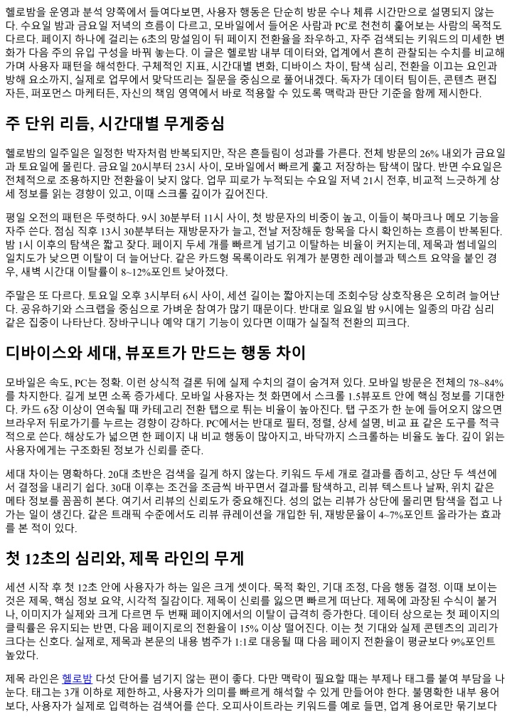헬로밤을운영과분석양쪽에서들여다보면, 사용자행동은단순히방문수나체류시간만으로설명되지않는 다. 수요일밤과금요일저녁의흐름이다르고, 모바일에서들어온사람과 PC로천천히훑어보는사람의목적도 다르다. 페이지하나에걸리는 6초의망설임이뒤페이지전환율을좌우하고, 자주검색되는키워드의미세한변 화가다음주의유입구성을바꿔놓는다. 이글은헬로밤내부데이터와, 업계에서흔히관찰되는수치를비교해 가며사용자패턴을해석한다. 구체적인지표, 시간대별변화, 디바이스차이, 탐색심리, 전환을이끄는요인과 방해요소까지, 실제로업무에서맞닥뜨리는질문을중심으로풀어내겠다. 독자가데이터팀이든, 콘텐츠편집 자든, 퍼포먼스마케터든, 자신의책임영역에서바로적용할수있도록맥락과판단기준을함께제시한다. 주단위리듬, 시간대별무게중심 헬로밤의일주일은일정한박자처럼반복되지만, 작은흔들림이성과를가른다. 전체방문의 26% 내외가금요일 과토요일에몰린다. 금요일 20시부터 23시사이, 모바일에서빠르게훑고저장하는탐색이많다. 반면수요일은 전체적으로조용하지만전환율이낮지않다. 업무피로가누적되는수요일저녁 21시전후, 비교적느긋하게상 세정보를읽는경향이있고, 이때스크롤깊이가깊어진다. 평일오전의패턴은뚜렷하다. 9시 30분부터 11시사이, 첫방문자의비중이높고, 이들이북마크나메모기능을 자주쓴다. 점심직후 13시 30분부터는재방문자가늘고, 전날저장해둔항목을다시확인하는흐름이반복된다. 밤 1시이후의탐색은짧고잦다. 페이지두세개를빠르게넘기고이탈하는비율이커지는데, 제목과썸네일의 일치도가낮으면이탈이더늘어난다. 같은카드형목록이라도위계가분명한레이블과텍스트요약을붙인경 우, 새벽시간대이탈률이 8~12%포인트낮아졌다. 주말은또다르다. 토요일오후 3시부터 6시사이, 세션길이는짧아지는데조회수당상호작용은오히려늘어난 다. 공유하기와스크랩을중심으로가벼운참여가많기때문이다. 반대로일요일밤 9시에는일종의마감심리 같은집중이나타난다. 장바구니나예약대기기능이있다면이때가실질적전환의피크다. 디바이스와세대, 뷰포트가만드는행동차이 모바일은속도, PC는정확. 이런상식적결론뒤에실제수치의결이숨겨져있다. 모바일방문은전체의 78~84% 를차지한다. 길게보면소폭증가세다. 모바일사용자는첫화면에서스크롤 1.5뷰포트안에핵심정보를기대한 다. 카드 6장이상이연속될때카테고리전환탭으로튀는비율이높아진다. 탭구조가한눈에들어오지않으면 브라우저뒤로가기를누르는경향이강하다. PC에서는반대로필터, 정렬, 상세설명, 비교표같은도구를적극 적으로쓴다. 해상도가넓으면한페이지내비교행동이많아지고, 바닥까지스크롤하는비율도높다. 깊이읽는 사용자에게는구조화된정보가신뢰를준다. 세대차이는명확하다. 20대초반은검색을길게하지않는다. 키워드두세개로결과를좁히고, 상단두섹션에 서결정을내리기쉽다. 30대이후는조건을조금씩바꾸면서결과를탐색하고, 리뷰텍스트나날짜, 위치같은 메타정보를꼼꼼히본다. 여기서리뷰의신뢰도가중요해진다. 성의없는리뷰가상단에몰리면탐색을접고나 가는일이생긴다. 같은트래픽수준에서도리뷰큐레이션을개입한뒤, 재방문율이 4~7%포인트올라가는효과 를본적이있다. 첫 12초의심리와, 제목라인의무게 세션시작후첫 12초안에사용자가하는일은크게셋이다. 목적확인, 기대조정, 다음행동결정. 이때보이는 것은제목, 핵심정보요약, 시각적질감이다. 제목이신뢰를잃으면빠르게떠난다. 제목에과장된수식이붙거 나, 이미지가실제와크게다르면두번째페이지에서의이탈이급격히증가한다. 데이터상으로는첫페이지의 클릭률은유지되는반면, 다음페이지로의전환율이 15% 이상떨어진다. 이는첫기대와실제콘텐츠의괴리가 크다는신호다. 실제로, 제목과본문의내용범주가 1:1로대응될때다음페이지전환율이평균보다 9%포인트 높았다. 제목라인은헬로밤다섯단어를넘기지않는편이좋다. 다만맥락이필요할때는부제나태그를붙여부담을나 눈다. 태그는 3개이하로제한하고, 사용자가의미를빠르게해석할수있게만들어야한다. 불명확한내부용어 보다, 사용자가실제로입력하는검색어를쓴다. 오피사이트라는키워드를예로들면, 업계용어로만묶기보다