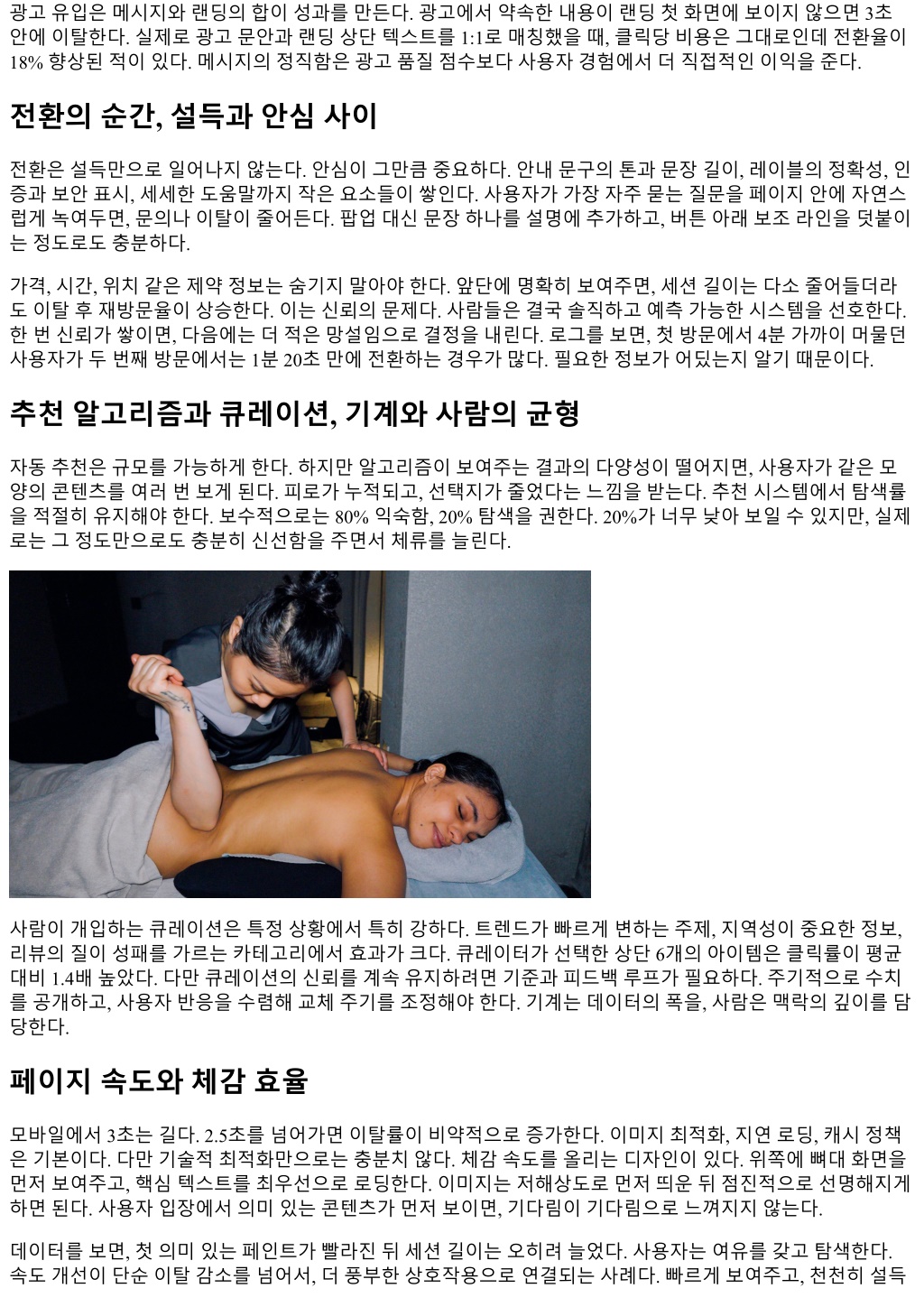 광고유입은메시지와랜딩의합이성과를만든다. 광고에서약속한내용이랜딩첫화면에보이지않으면 3초 안에이탈한다. 실제로광고문안과랜딩상단텍스트를 1:1로매칭했을때, 클릭당비용은그대로인데전환율이 18% 향상된적이있다. 메시지의정직함은광고품질점수보다사용자경험에서더직접적인이익을준다. 전환의순간, 설득과안심사이 전환은설득만으로일어나지않는다. 안심이그만큼중요하다. 안내문구의톤과문장길이, 레이블의정확성, 인 증과보안표시, 세세한도움말까지작은요소들이쌓인다. 사용자가가장자주묻는질문을페이지안에자연스 럽게녹여두면, 문의나이탈이줄어든다. 팝업대신문장하나를설명에추가하고, 버튼아래보조라인을덧붙이 는정도로도충분하다. 가격, 시간, 위치같은제약정보는숨기지말아야한다. 앞단에명확히보여주면, 세션길이는다소줄어들더라 도이탈후재방문율이상승한다. 이는신뢰의문제다. 사람들은결국솔직하고예측가능한시스템을선호한다. 한번신뢰가쌓이면, 다음에는더적은망설임으로결정을내린다. 로그를보면, 첫방문에서 4분가까이머물던 사용자가두번째방문에서는 1분 20초만에전환하는경우가많다. 필요한정보가어딨는지알기때문이다. 추천알고리즘과큐레이션, 기계와사람의균형 자동추천은규모를가능하게한다. 하지만알고리즘이보여주는결과의다양성이떨어지면, 사용자가같은모 양의콘텐츠를여러번보게된다. 피로가누적되고, 선택지가줄었다는느낌을받는다. 추천시스템에서탐색률 을적절히유지해야한다. 보수적으로는 80% 익숙함, 20% 탐색을권한다. 20%가너무낮아보일수있지만, 실제 로는그정도만으로도충분히신선함을주면서체류를늘린다. 사람이개입하는큐레이션은특정상황에서특히강하다. 트렌드가빠르게변하는주제, 지역성이중요한정보, 리뷰의질이성패를가르는카테고리에서효과가크다. 큐레이터가선택한상단 6개의아이템은클릭률이평균 대비 1.4배높았다. 다만큐레이션의신뢰를계속유지하려면기준과피드백루프가필요하다. 주기적으로수치 를공개하고, 사용자반응을수렴해교체주기를조정해야한다. 기계는데이터의폭을, 사람은맥락의깊이를담 당한다. 페이지속도와체감효율 모바일에서 3초는길다. 2.5초를넘어가면이탈률이비약적으로증가한다. 이미지최적화, 지연로딩, 캐시정책 은기본이다. 다만기술적최적화만으로는충분치않다. 체감속도를올리는디자인이있다. 위쪽에뼈대화면을 먼저보여주고, 핵심텍스트를최우선으로로딩한다. 이미지는저해상도로먼저띄운뒤점진적으로선명해지게 하면된다. 사용자입장에서의미있는콘텐츠가먼저보이면, 기다림이기다림으로느껴지지않는다. 데이터를보면, 첫의미있는페인트가빨라진뒤세션길이는오히려늘었다. 사용자는여유를갖고탐색한다. 속도개선이단순이탈감소를넘어서, 더풍부한상호작용으로연결되는사례다. 빠르게보여주고, 천천히설득
