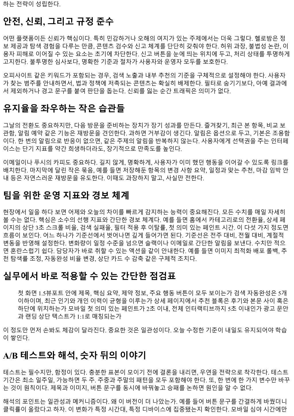 하는전략이성립한다. 안전, 신뢰, 그리고규정준수 어떤플랫폼이든신뢰가핵심이다. 특히민감하거나오해의여지가있는주제에서는더욱그렇다. 헬로밤은정 보제공과탐색경험을다루는만큼, 콘텐츠검수와신고체계를단단히갖춰야한다. 허위과장, 불법성논란, 이 용자피해로이어질수있는요소는초기에차단한다. 신고버튼을눈에띄는위치에두고, 처리상태를투명하게 고지한다. 불투명한심사보다, 명확한기준과절차가사용자와운영자모두를보호한다. 오피사이트같은키워드가포함되는경우, 검색노출과내부추천의기준을구체적으로설정해야한다. 사용자 가찾는범주를안내하면서, 법과정책에저촉되는콘텐츠는확실히배제한다. 필터로숨기기보다, 아예결과에 서제외하거나경고문구를붙여판단을돕는다. 신뢰를잃는순간트래픽은의미가없다. 유지율을좌우하는작은습관들 그날의전환도중요하지만, 다음방문을준비하는장치가장기성과를만든다. 즐겨찾기, 최근본항목, 비교보 관함, 알림예약같은기능은재방문을견인한다. 과하면거부감이생긴다. 알림은옵션으로두고, 기본은조용함 이다. 한번의알림으로반응이없으면, 같은주제의알림을반복하지않는다. 사용자에게선택권을주는인터페 이스는단기지표를약간희생하더라도, 장기적으로만족도를높인다. 이메일이나푸시의카피도중요하다. 길지않게, 명확하게, 사용자가이미했던행동을이어갈수있도록링크를 배치한다. 마지막에달린작은묶음, 예를들면저장해둔항목의변경사항요약, 일정과맞는추천, 마감임박안 내등은자연스러운재방문을유도한다. 이때도과장하지말고, 사실만전한다. 팀을위한운영지표와경보체계 현장에서일을하다보면어제와오늘의차이를빠르게감지하는능력이중요해진다. 모든수치를매일자세히 볼수는없다. 핵심은소수의선행지표와간단한경보체계다. 예를들면홈에서카테고리로의전환율, 상세페 이지의상단 3초스크롤비율, 검색실패율, 필터적용후이탈률, 첫의미있는페인트시간. 이다섯가지정도면 흐름이보인다. 어느하나가기준선에서벗어나면깊게들어가면된다. 기준선은전주대비, 전월대비, 계절적 변동을반영해설정한다. 변화량이일정수준을넘으면슬랙이나이메일로간단한알림을보낸다. 수치만적으 면혼란스럽기쉽다. 담당자가바로취할수있는액션을같이안내한다. 예를들면이미지최적화배포롤백, 추 천탐색률조정, 자동완성비율변경, 상단카드수감축같은구체적조치다. 실무에서바로적용할수있는간단한점검표 첫화면 1.5뷰포트안에제목, 핵심요약, 제약정보, 주요행동버튼이모두보이는가검색자동완성은 5개 이하이며, 최근인기와개인이력이균형을이루는가상세페이지에서추천블록은후기와본문사이혹은 하단에위치하는가모바일첫의미있는페인트가 2초이내, 전체인터랙티브까지 5초이내인가광고문안 과랜딩상단텍스트가 1:1로매칭되는가 이정도만먼저손봐도체감이달라진다. 중요한것은일관성이다. 오늘수정한기준이내일도유지되어야학습 이쌓인다. A/B 테스트와해석, 숫자뒤의이야기 테스트는필수지만, 함정이있다. 충분한표본이모이기전에결론을내리면, 우연을전략으로착각한다. 테스트 기간은최소일주일, 가능하면두주. 주중과주말의패턴을모두포함해야한다. 또, 한번에한가지변수만바꾸 는것이원칙이다. 제목과이미지, 버튼문구를동시에바꿔놓고승패를논하면원인을알수없다. 해석의포인트는일관성과메커니즘이다. 왜이버전이더나았는가. 예를들어버튼문구를간결하게바꿨더니 클릭률이올랐다고하자. 이변화가특정시간대, 특정디바이스에집중됐는지확인한다. 모바일심야시간에만
