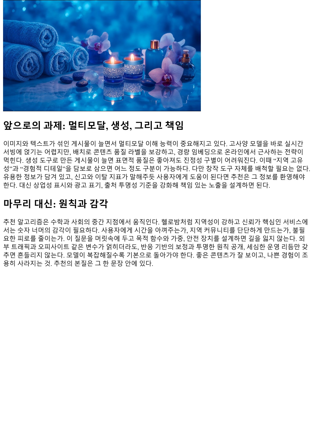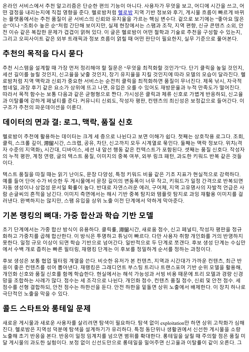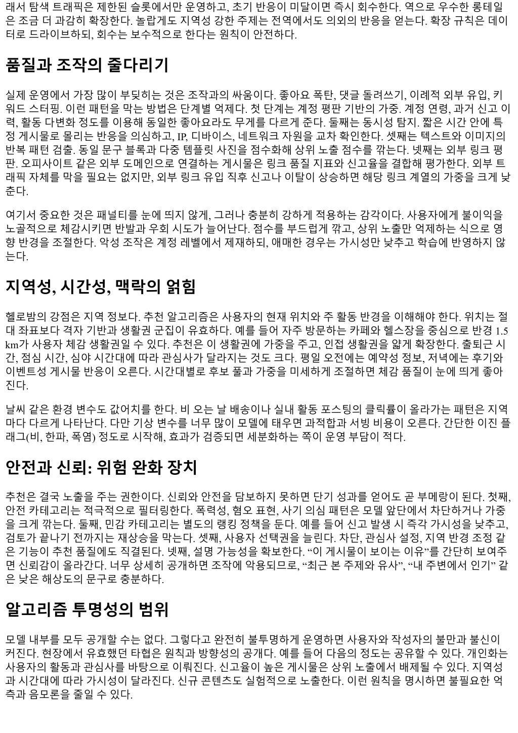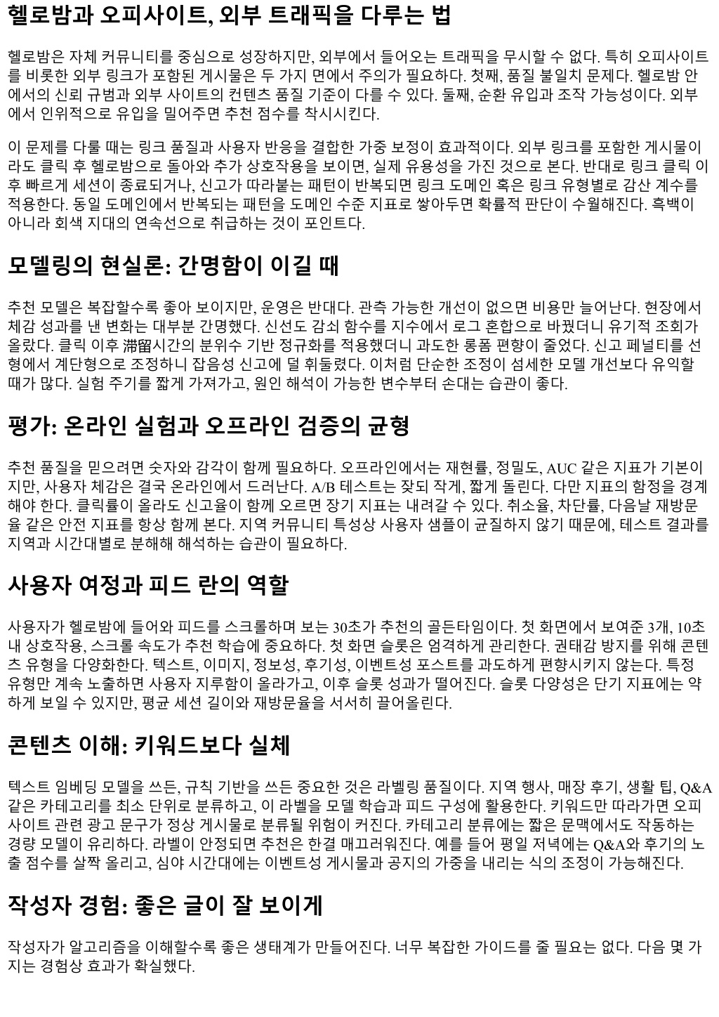 앞으로의과제: 멀티모달, 생성, 그리고책임 이미지와텍스트가섞인게시물이늘면서멀티모달이해능력이중요해지고있다. 고사양모델을바로실시간 서빙에얹기는어렵지만, 배치로콘텐츠품질라벨을보강하고, 경량임베딩으로온라인에서근사하는전략이 먹힌다. 생성도구로만든게시물이늘면표면적품질은좋아져도진정성구별이어려워진다. 이때 “지역고유 성”과 “경험적디테일”을담보로삼으면어느정도구분이가능하다. 다만창작도구자체를배척할필요는없다. 유용한정보가담겨있고, 신고와이탈지표가말해주듯사용자에게도움이된다면추천은그정보를환영해야 한다. 대신상업성표시와광고표기, 출처투명성기준을강화해책임있는노출을설계하면된다. 마무리대신: 원칙과감각 추천알고리즘은수학과사회의중간지점에서움직인다. 헬로밤처럼지역성이강하고신뢰가핵심인서비스에 서는숫자너머의감각이필요하다. 사용자에게시간을아껴주는가, 지역커뮤니티를단단하게만드는가, 불필 요한피로를줄이는가. 이질문을머릿속에두고목적함수와가중, 안전장치를설계하면길을잃지않는다. 외 부트래픽과오피사이트같은변수가얽히더라도, 반응기반의보정과투명한원칙공개, 세심한운영리듬만갖 추면흔들리지않는다. 모델이복잡해질수록기본으로돌아가야한다. 좋은콘텐츠가잘보이고, 나쁜경험이조 용히사라지는것. 추천의본질은그한문장안에있다.