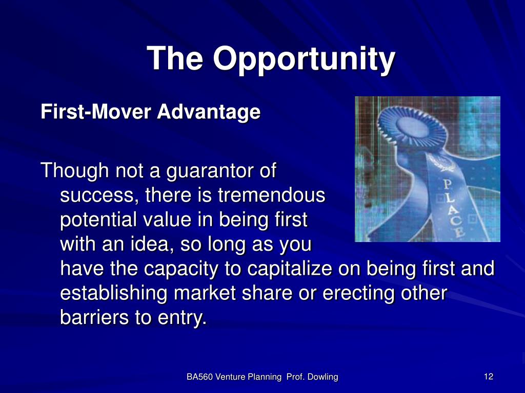 The Opportunity First-Mover Advantage Though not a guarantor of success, there is tremendous potential value in being first with an idea, so long as you have the capacity to capitalize on being first and establishing market share or erecting other barriers to entry. BA560 Venture Planning Prof. Dowling