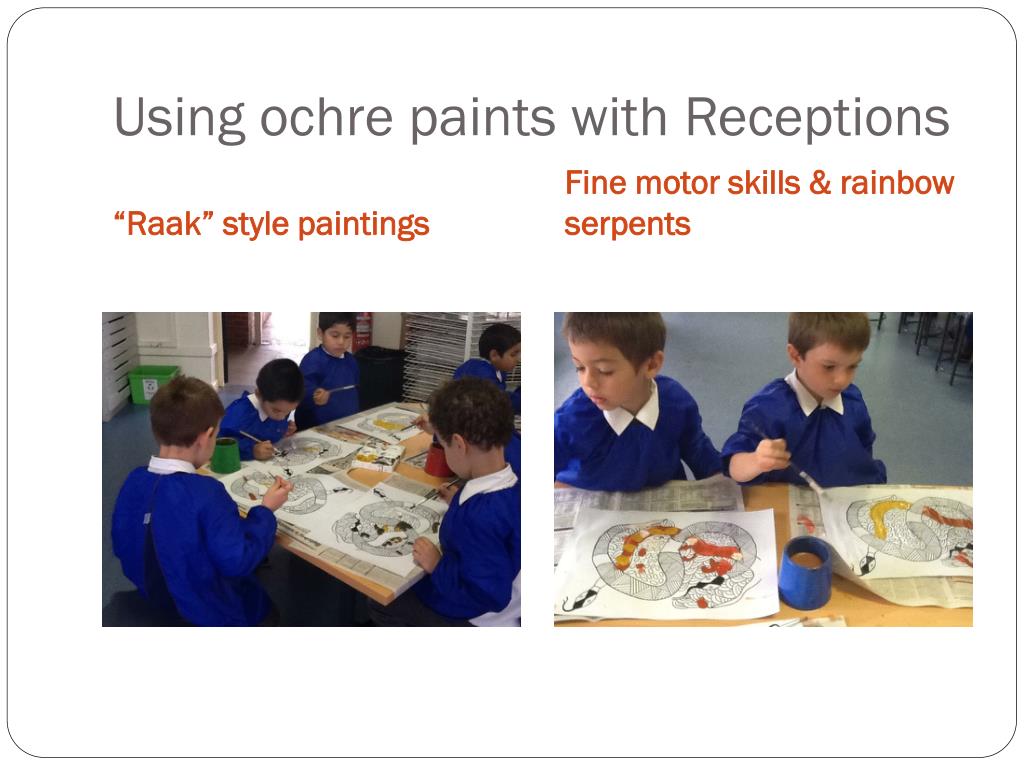 Using ochre paints with Receptions “Raak” style paintings Fine motor skills & rainbow serpents