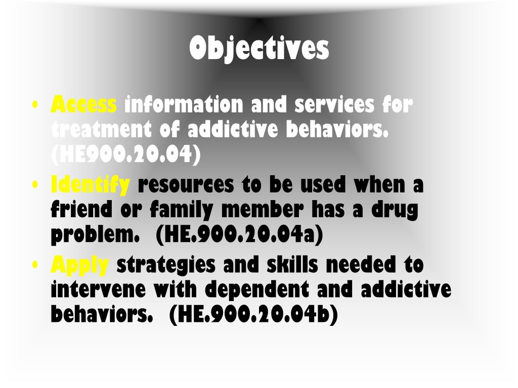 Objectives • Access information and services for treatment of addictive behaviors. (HE900.20.04) • Identify resources to be used when a friend or family member has a drug problem. (HE.900.20.04a) • Apply strategies and skills needed to intervene with dependent and addictive behaviors. (HE.900.20.04b)
