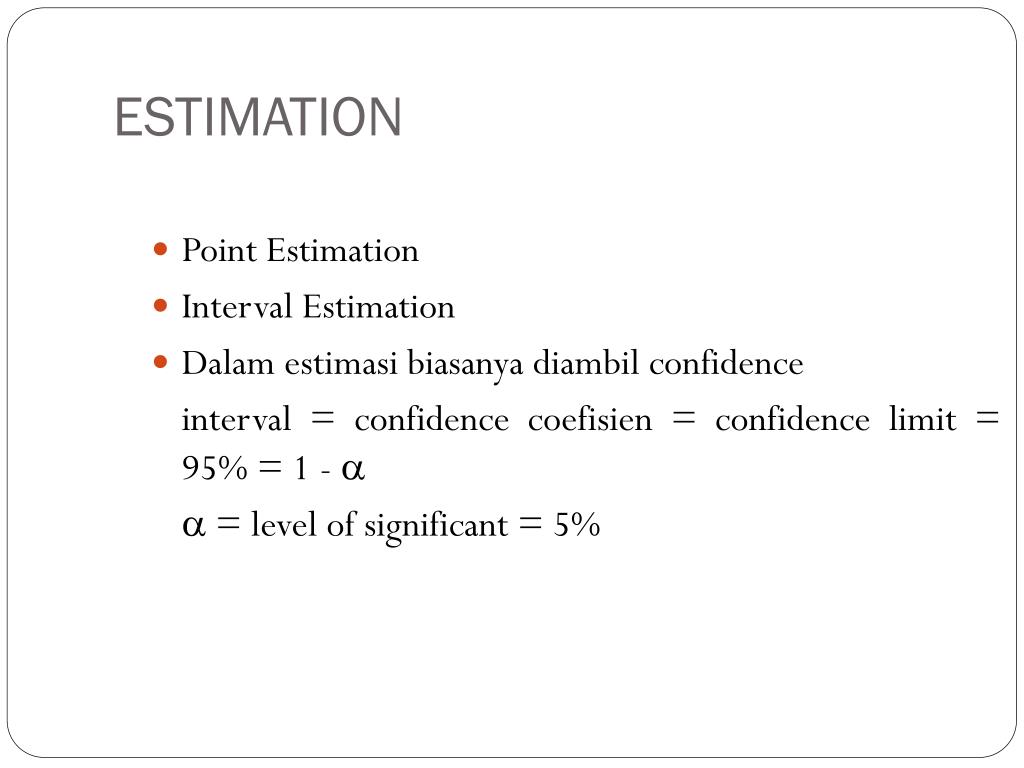 ESTIMATION • Point Estimation • Interval Estimation • Dalam estimasi biasanya diambil confidence interval = confidence coefisien = confidence limit = 95% = 1 - = level of significant = 5%
