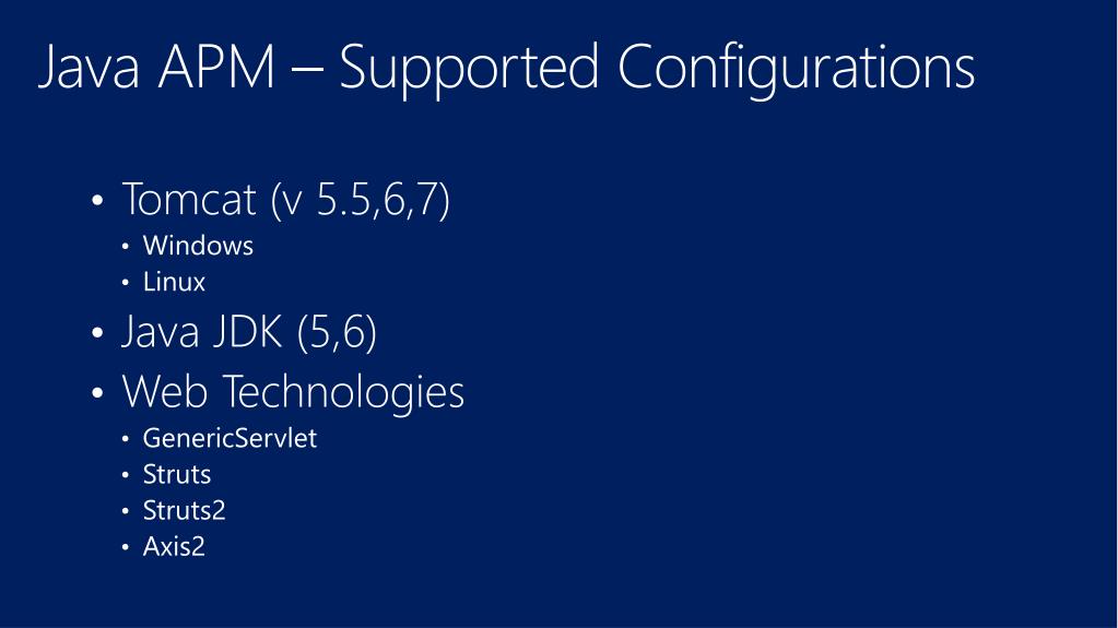 Java APM – Supported Configurations • Tomcat (v 5.5,6,7) • Windows • Linux • Java JDK (5,6) • Web Technologies • GenericServlet • Struts • Struts2 • Axis2