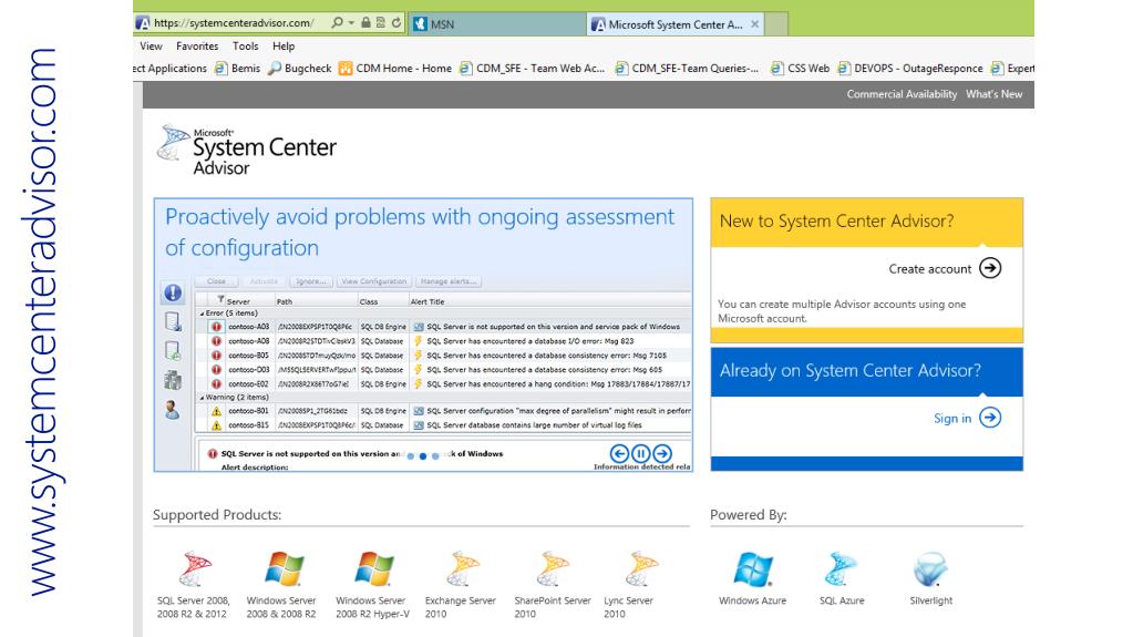 Proactive Monitoring with SC Advisor CUSTOMER CONFIGURATIONS Microsoft Customer Service and Support Knowledge Base BEST PRACTICE CONFIGURATION Lync Server SharePoint SQL Server Exchange Server Windows Server Fabric Components