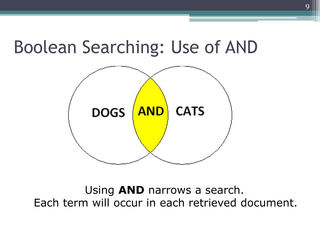 Boolean Searching: Use of AND Using AND narrows a search. Each term will occur in each retrieved document.