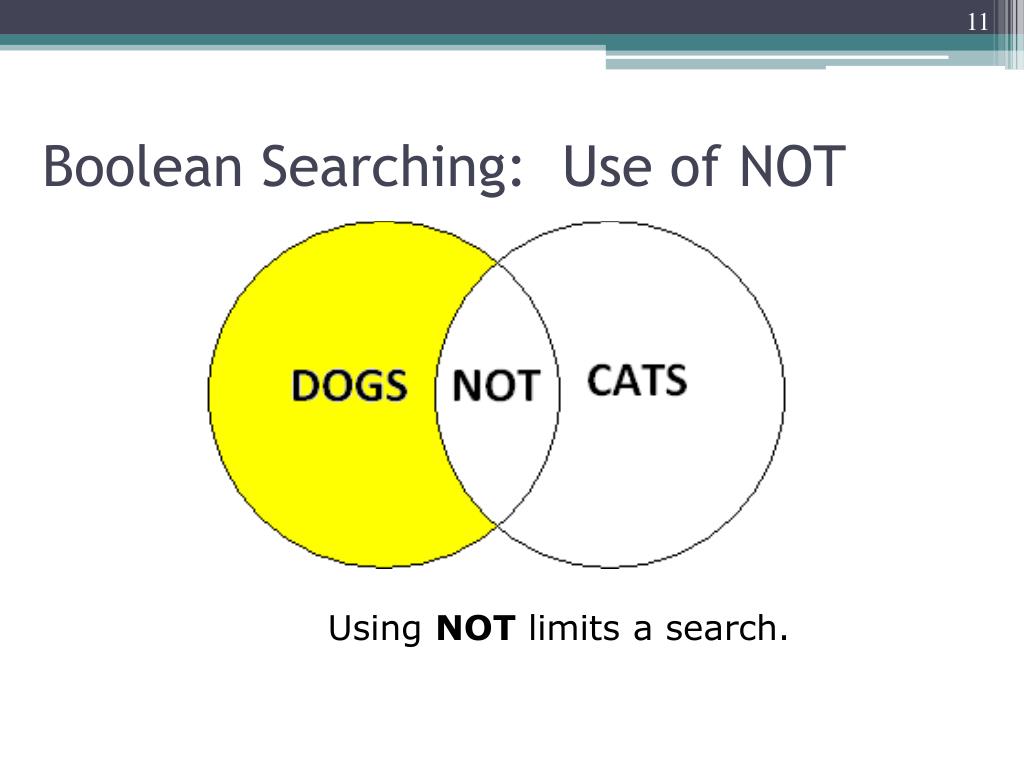 Boolean Searching: Use of NOT Using NOT limits a search.