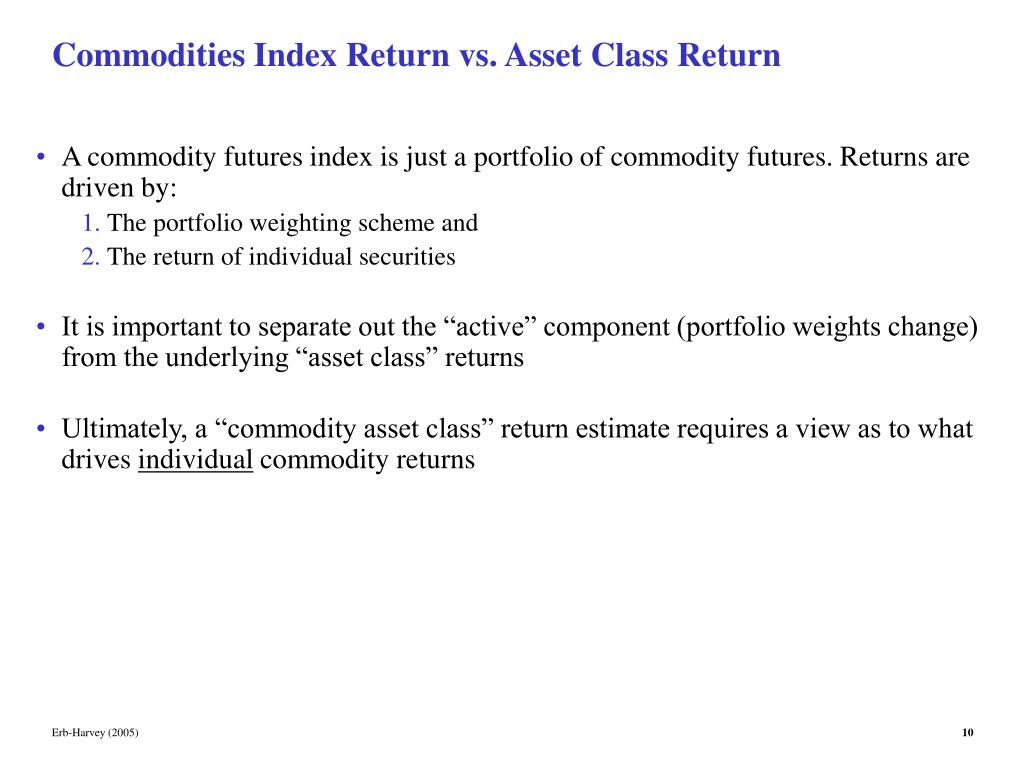 Commodities Index Return vs. Asset Class Return • A commodity futures index is just a portfolio of commodity futures. Returns are driven by: • The portfolio weighting scheme and • The return of individual securities • It is important to separate out the “active” component (portfolio weights change) from the underlying “asset class” returns • Ultimately, a “commodity asset class” return estimate requires a view as to what drives individual commodity returns Erb-Harvey (2005)