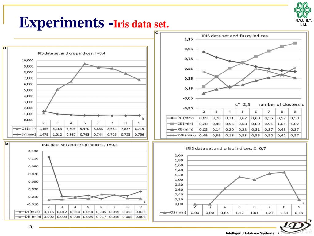 Experiments • To demonstrate the effectiveness of the proposed SV and OS indices for determining the optional number of clusters. • Artificial data set A1 • Artificial data set A2 • Artificial data set A3 • Iris data set • Wine data set • Glass data set