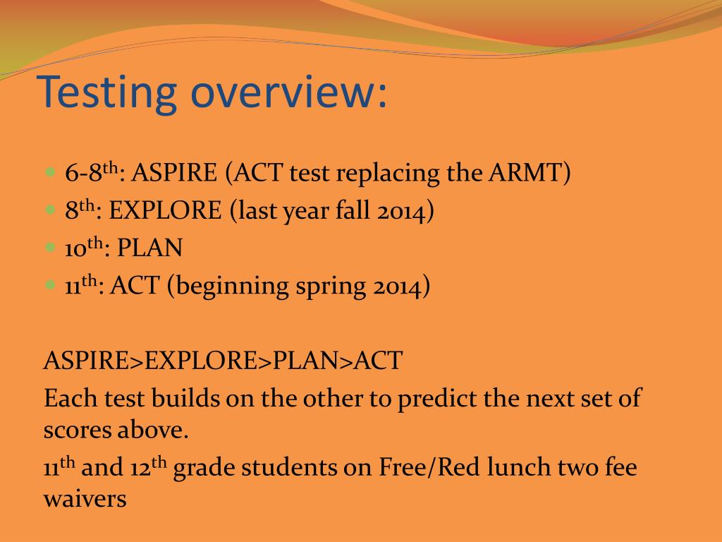Testing overview: • 6-8th: ASPIRE (ACT test replacing the ARMT) • 8th: EXPLORE (last year fall 2014) • 10th: PLAN • 11th: ACT (beginning spring 2014) ASPIRE>EXPLORE>PLAN>ACT Each test builds on the other to predict the next set of scores above. 11th and 12th grade students on Free/Red lunch two fee waivers