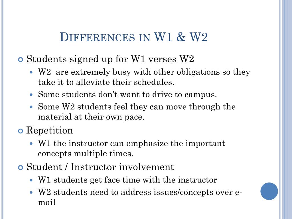 Differences in W1 & W2 • Students signed up for W1 verses W2 • W2 are extremely busy with other obligations so they take it to alleviate their schedules. • Some students don’t want to drive to campus. • Some W2 students feel they can move through the material at their own pace. • Repetition • W1 the instructor can emphasize the important concepts multiple times. • Student / Instructor involvement • W1 students get face time with the instructor • W2 students need to address issues/concepts over e-mail