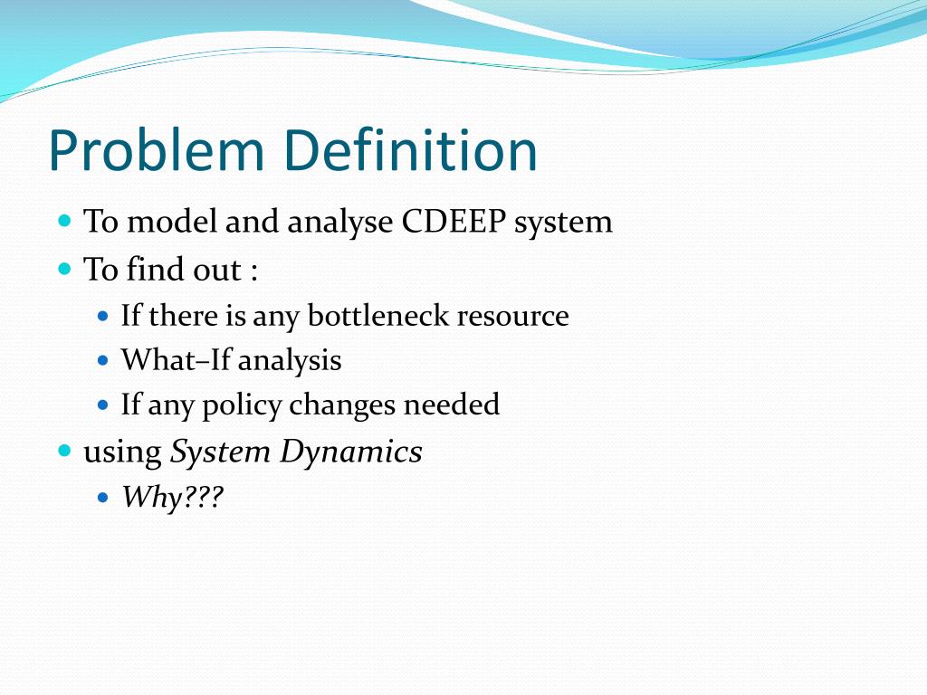 Problem Definition • To model and analyse CDEEP system • To find out : • If there is any bottleneck resource • What–If analysis • If any policy changes needed • using System Dynamics • Why???