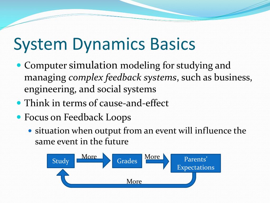 System Dynamics Basics • Computer simulation modeling for studying and managing complex feedback systems, such as business, engineering, and social systems • Think in terms of cause-and-effect • Focus on Feedback Loops • situation when output from an event will influence the same event in the future Study Grades Parents’ Expectations More More More