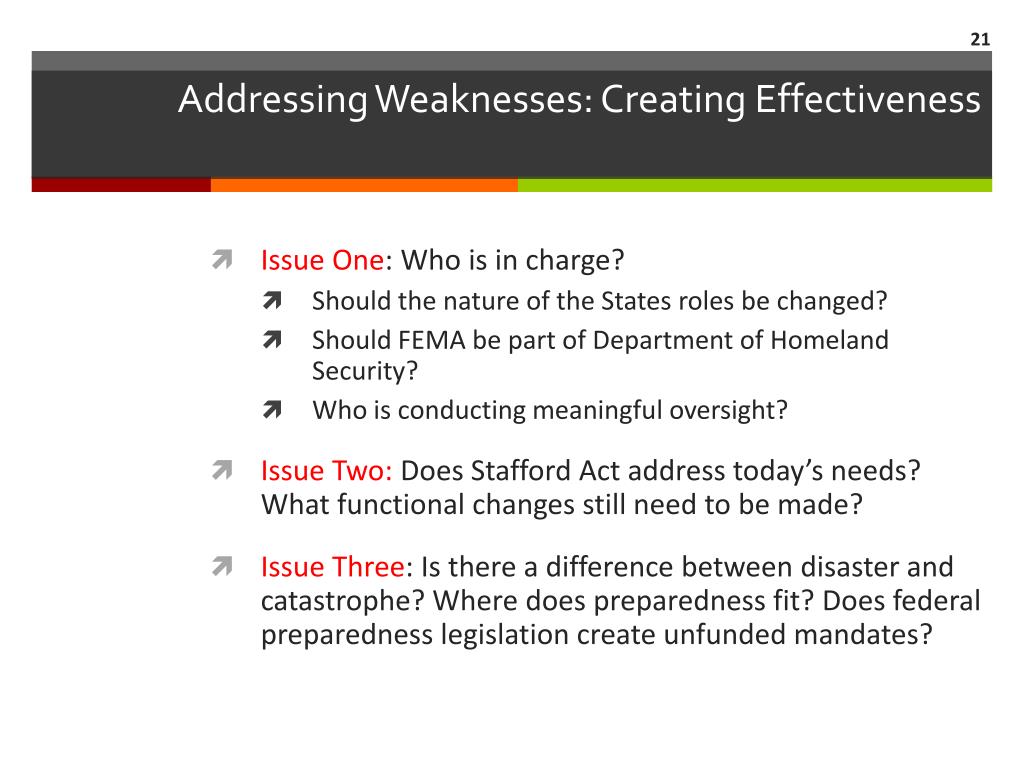 Addressing Weaknesses: Creating Effectiveness • Issue One: Who is in charge? • Should the nature of the States roles be changed? • Should FEMA be part of Department of Homeland Security? • Who is conducting meaningful oversight? • Issue Two: Does Stafford Act address today’s needs? What functional changes still need to be made? • Issue Three: Is there a difference between disaster and catastrophe? Where does preparedness fit? Does federal preparedness legislation create unfunded mandates?
