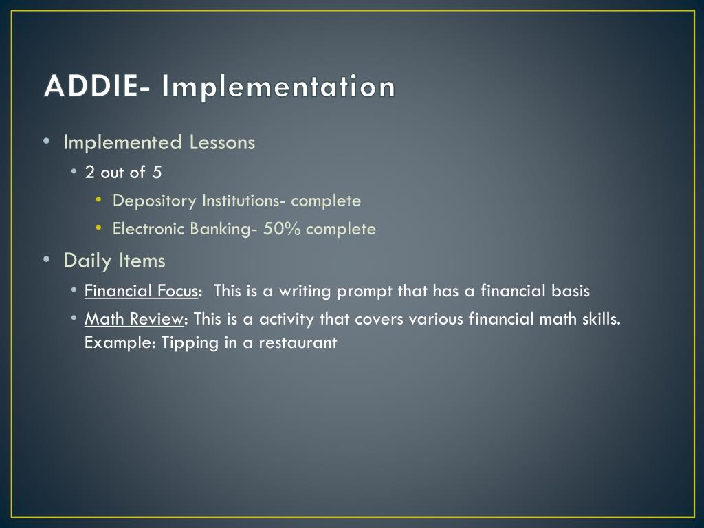 ADDIE- Implementation • Implemented Lessons • 2 out of 5 • Depository Institutions- complete • Electronic Banking- 50% complete • Daily Items • Financial Focus: This is a writing prompt that has a financial basis • Math Review: This is a activity that covers various financial math skills. Example: Tipping in a restaurant