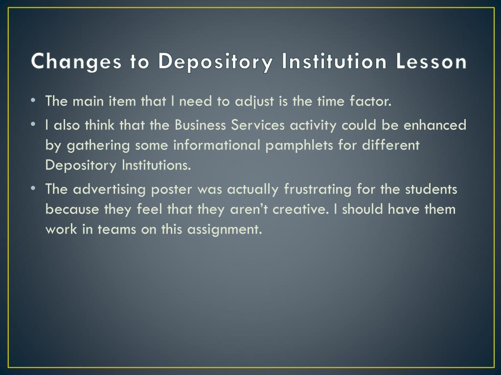 Changes to Depository Institution Lesson • The main item that I need to adjust is the time factor. • I also think that the Business Services activity could be enhanced by gathering some informational pamphlets for different Depository Institutions. • The advertising poster was actually frustrating for the students because they feel that they aren’t creative. I should have them work in teams on this assignment.