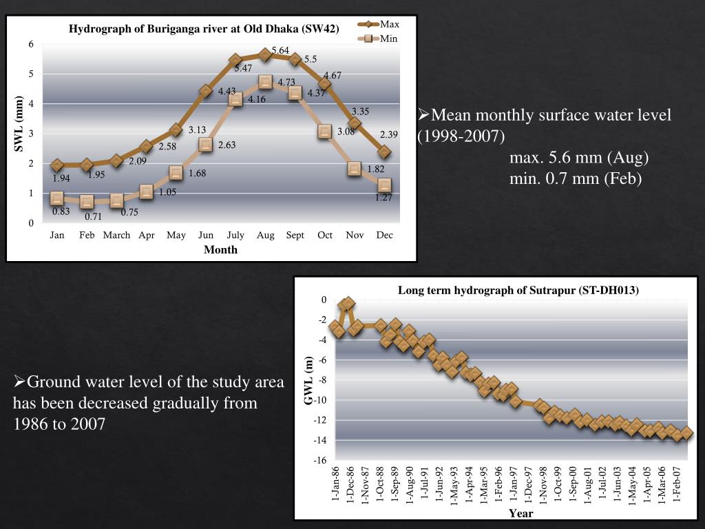 Mean monthly surface water level (1998-2007) • max. 5.6 mm (Aug) • min. 0.7 mm (Feb) • Ground water level of the study area has been decreased gradually from 1986 to 2007
