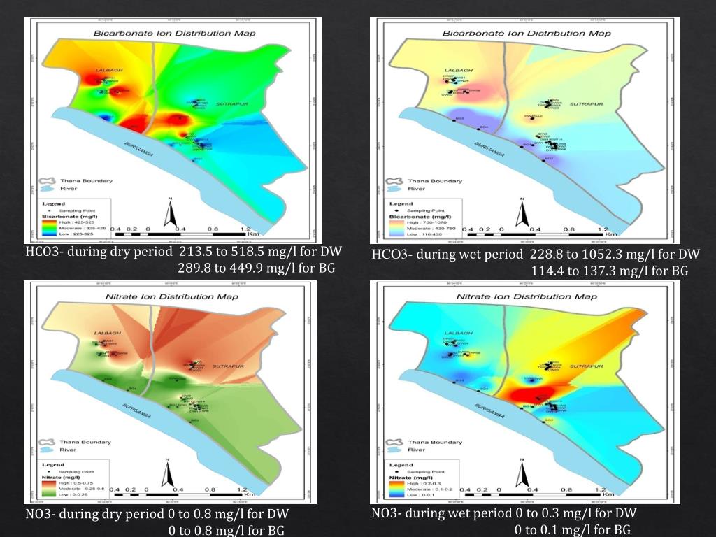 HCO3- during dry period 213.5 to 518.5 mg/l for DW 289.8 to 449.9 mg/l for BG HCO3- during wet period 228.8 to 1052.3 mg/l for DW 114.4 to 137.3 mg/l for BG NO3- during wet period 0 to 0.3 mg/l for DW 0 to 0.1 mg/l for BG NO3- during dry period 0 to 0.8 mg/l for DW 0 to 0.8 mg/l for BG