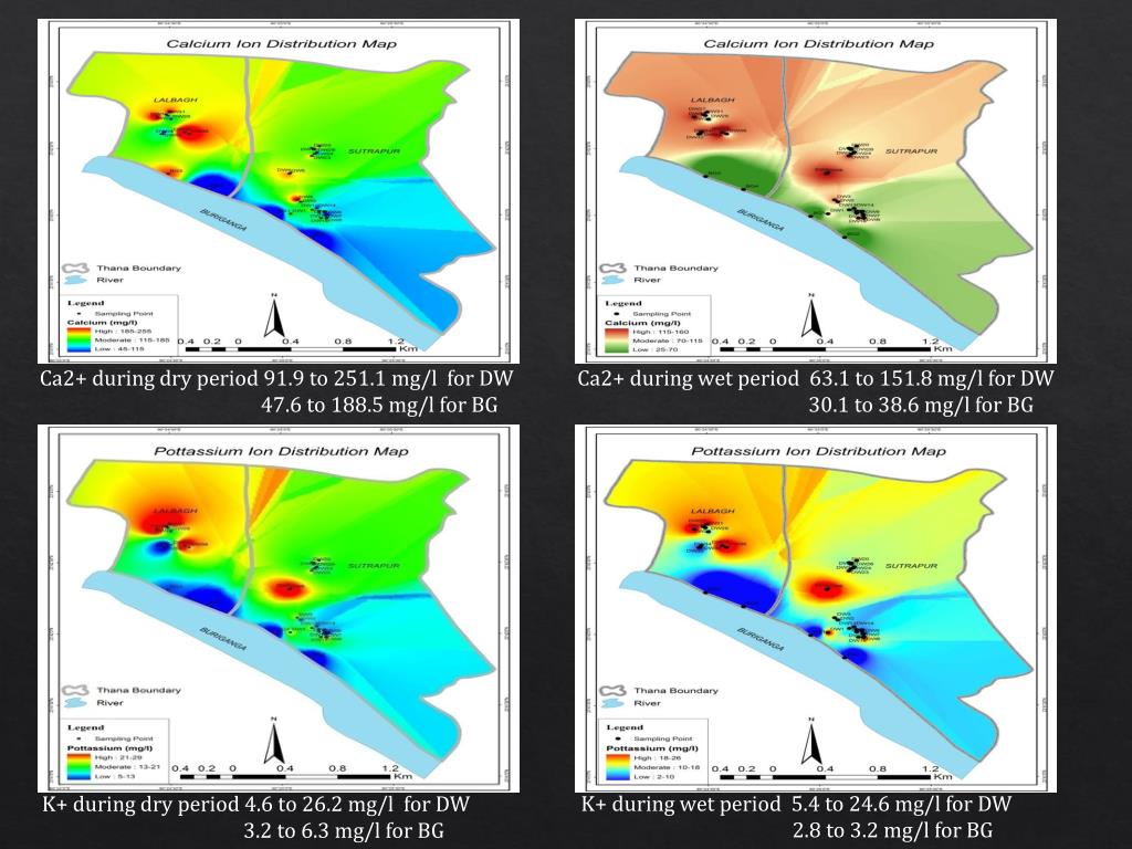 Ca2+ during dry period 91.9 to 251.1 mg/l for DW 47.6 to 188.5 mg/l for BG Ca2+ during wet period 63.1 to 151.8 mg/l for DW 30.1 to 38.6 mg/l for BG K+ during wet period 5.4 to 24.6 mg/l for DW 2.8 to 3.2 mg/l for BG K+ during dry period 4.6 to 26.2 mg/l for DW 3.2 to 6.3 mg/l for BG