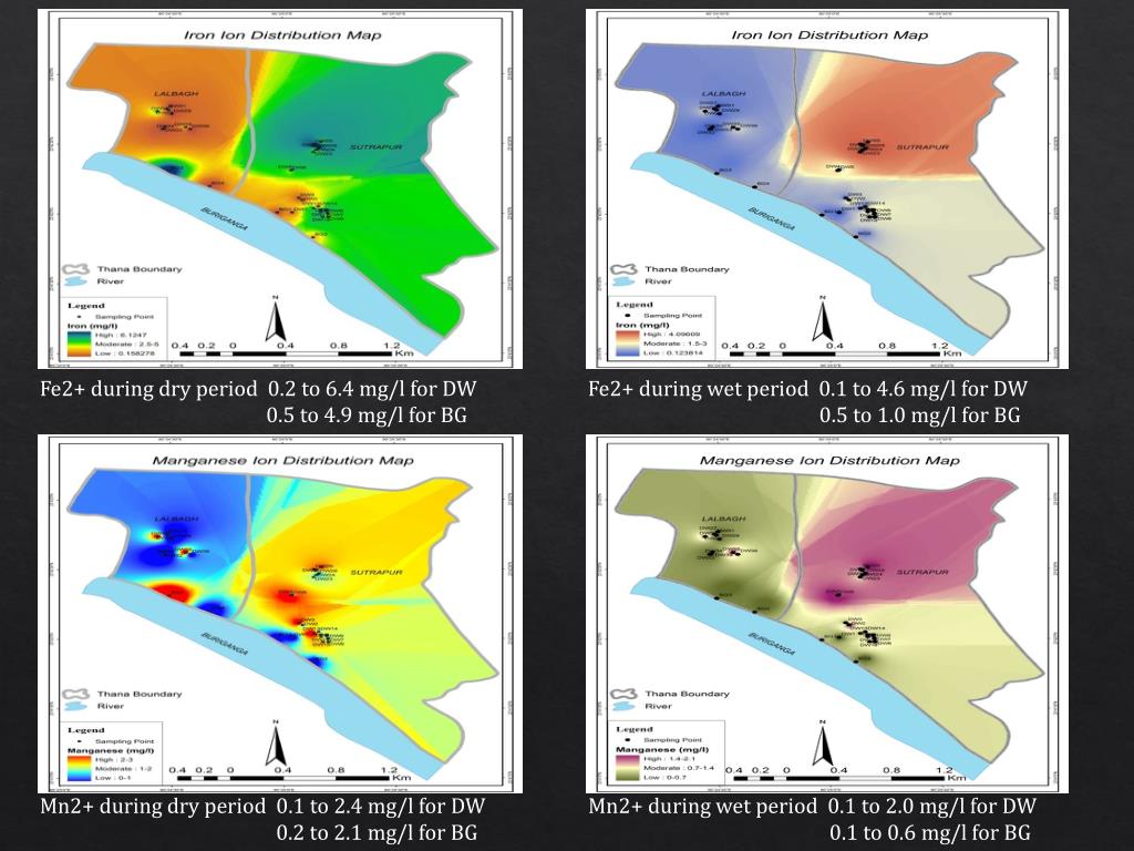 Fe2+ during dry period 0.2 to 6.4 mg/l for DW 0.5 to 4.9 mg/l for BG Fe2+ during wet period 0.1 to 4.6 mg/l for DW 0.5 to 1.0 mg/l for BG Mn2+ during dry period 0.1 to 2.4 mg/l for DW 0.2 to 2.1 mg/l for BG Mn2+ during wet period 0.1 to 2.0 mg/l for DW 0.1 to 0.6 mg/l for BG