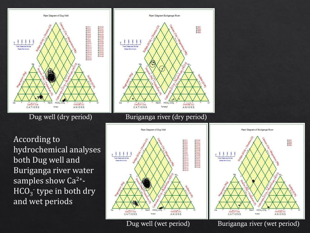 Dug well (dry period) Buriganga river (dry period) According to hydrochemical analyses both Dug well and Buriganga river water samples show Ca2+-HCO3-type in both dry and wet periods Dug well (wet period) Buriganga river (wet period)